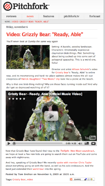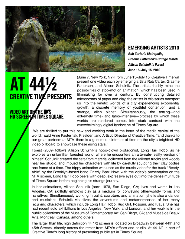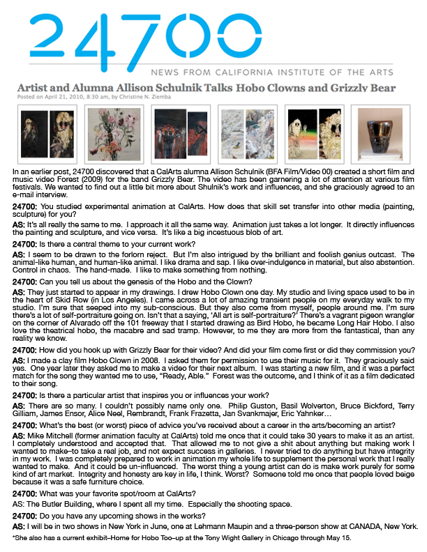 Schulnik has been making animated films since she was 17. Her films have been included in internationally renowned festivals and museums including the Hammer Museum, Los Angeles, LACMA, Annecy International Animated Film Festival and Animafest Zagreb. She received “Best Experimental Animation” at the Ottawa International Animation Festival and Special Jury Prize at SXSW FIlm.