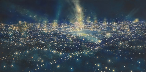 In his work, Ekstedt explores the concept of human connectivity and our relationship to the planet. His paintings often depict human populations as networks of light particles, symbolizing their presence and impact on the landscape. He is also fascinated by the celestial and cosmological connections between humans and Earth, often incorporating imagery that reflects this relationship. Through his art, Ekstedt aims to highlight the interconnectivity of all things and the systems and patterns found in the universe.