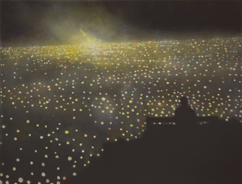 In his recent series of paintings entitled "Monument to Nature," Ekstedt incorporates human-made monuments in his paintings of cityscapes at night. However, these monuments only add to the chaotic luminosity of the city and serve as a reflection of the misguided human attempt to pay tribute to nature. This series explores the tension between human impact and our aspirations for a harmonious relationship with the natural world.