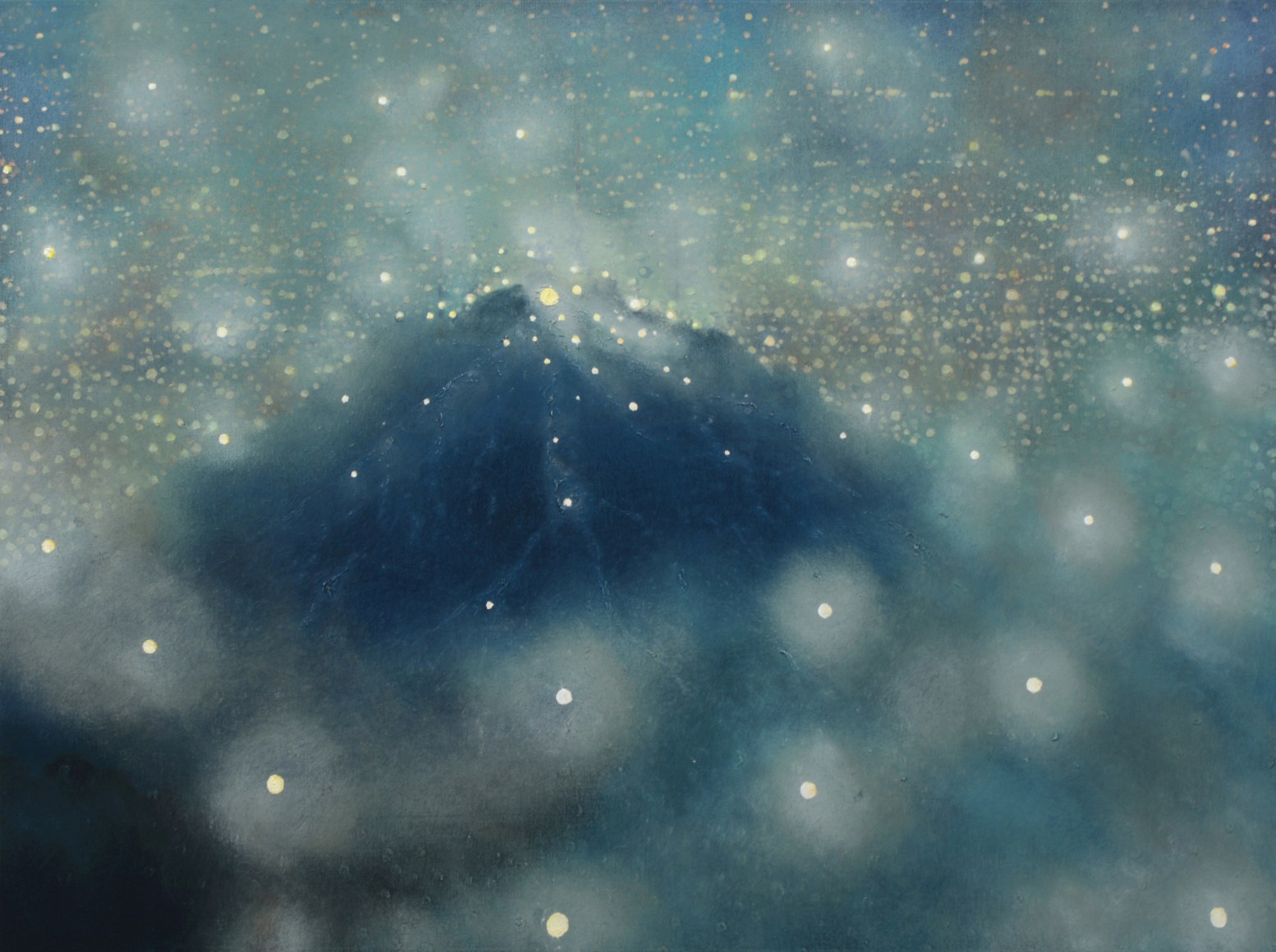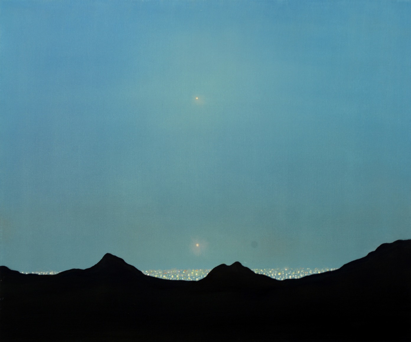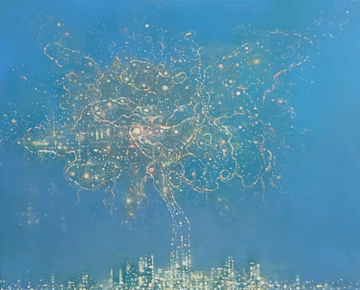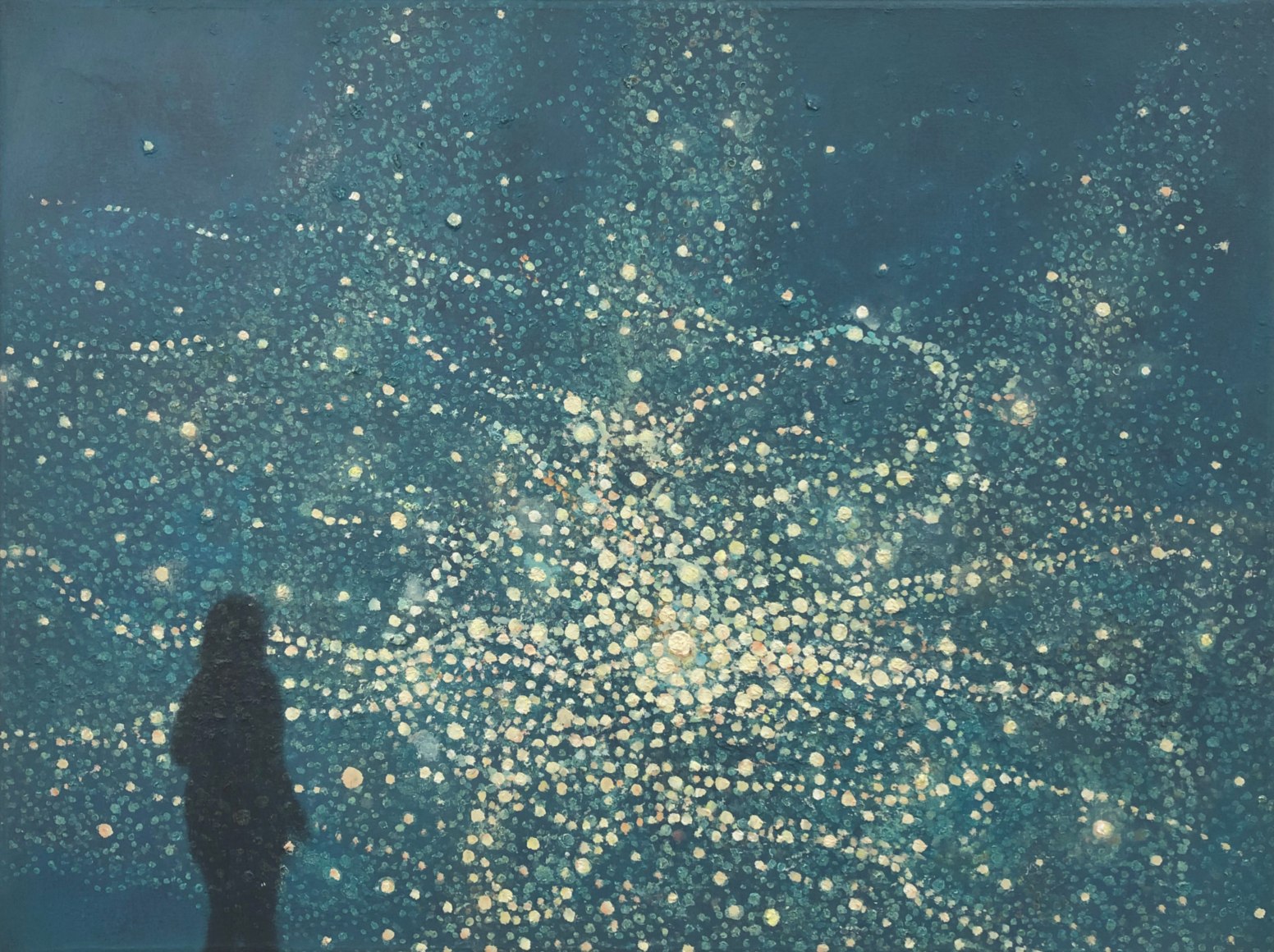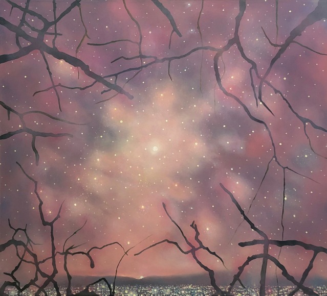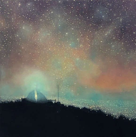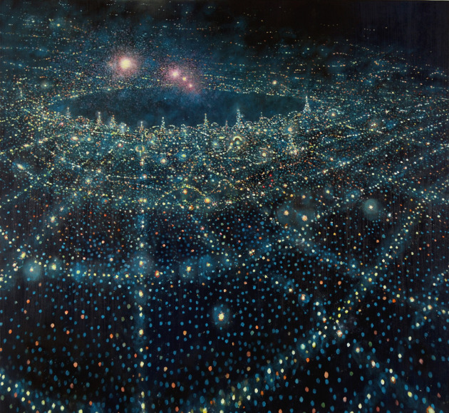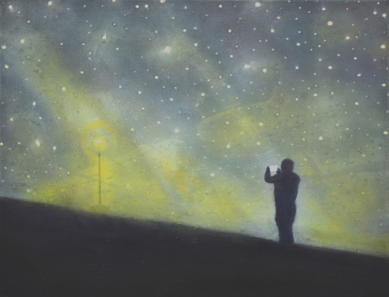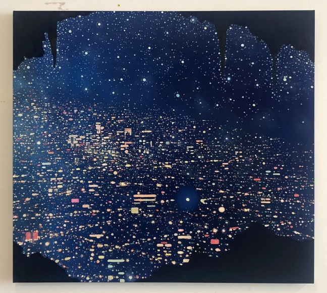 In his work, Ekstedt explores the concept of human connectivity and our relationship to the planet. His paintings often depict human populations as networks of light particles, symbolizing their presence and impact on the landscape. He is also fascinated by the celestial and cosmological connections between humans and Earth, often incorporating imagery that reflects this relationship. Through his art, Ekstedt aims to highlight the interconnectivity of all things and the systems and patterns found in the universe.