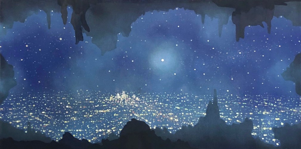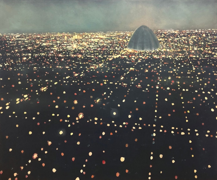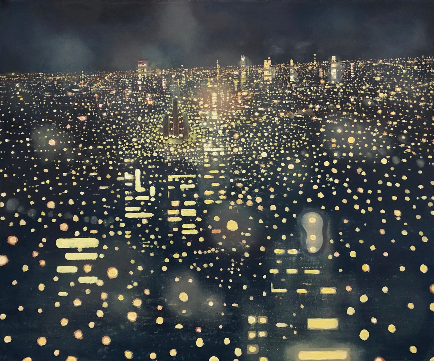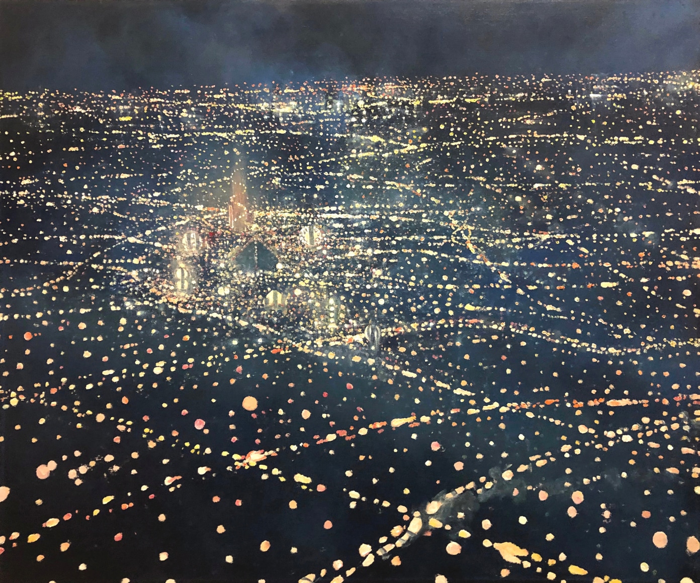 In his recent series of paintings entitled "Monument to Nature," Ekstedt incorporates human-made monuments in his paintings of cityscapes at night. However, these monuments only add to the chaotic luminosity of the city and serve as a reflection of the misguided human attempt to pay tribute to nature. This series explores the tension between human impact and our aspirations for a harmonious relationship with the natural world.