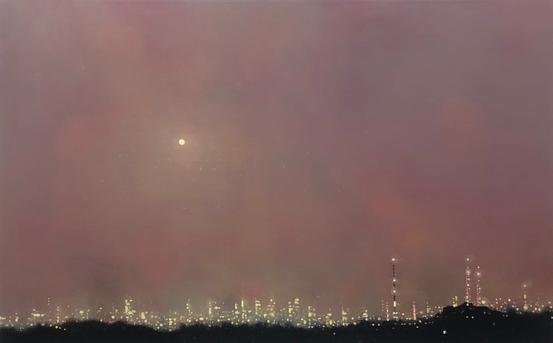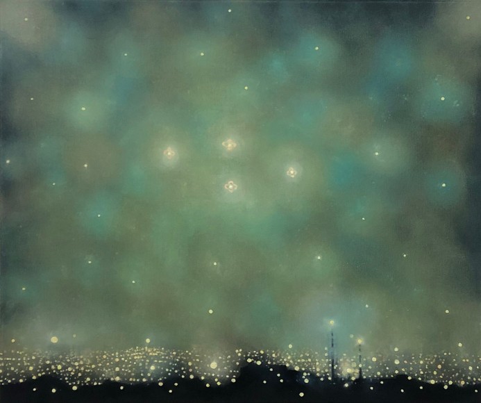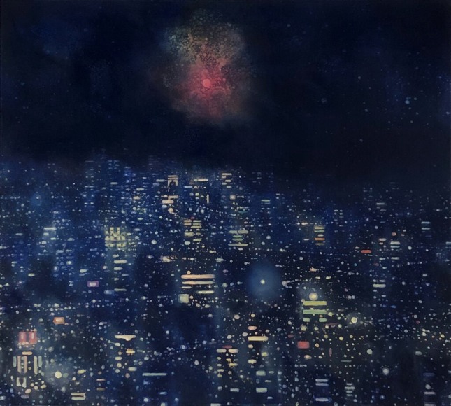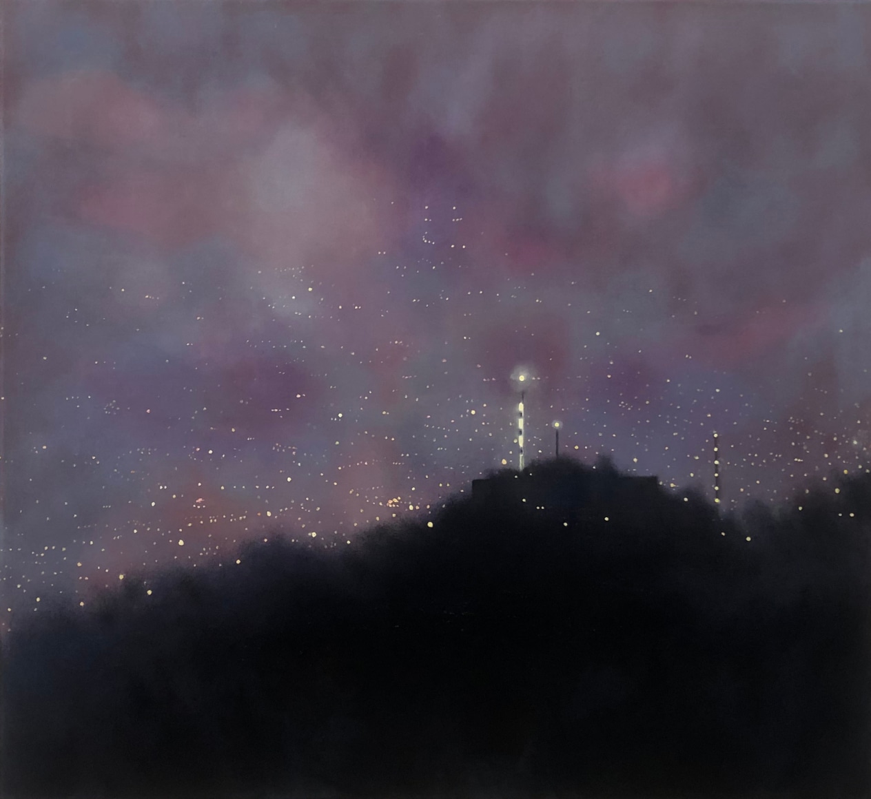 In his recent series of paintings entitled "Monument to Nature," Ekstedt incorporates human-made monuments in his paintings of cityscapes at night. However, these monuments only add to the chaotic luminosity of the city and serve as a reflection of the misguided human attempt to pay tribute to nature. This series explores the tension between human impact and our aspirations for a harmonious relationship with the natural world.