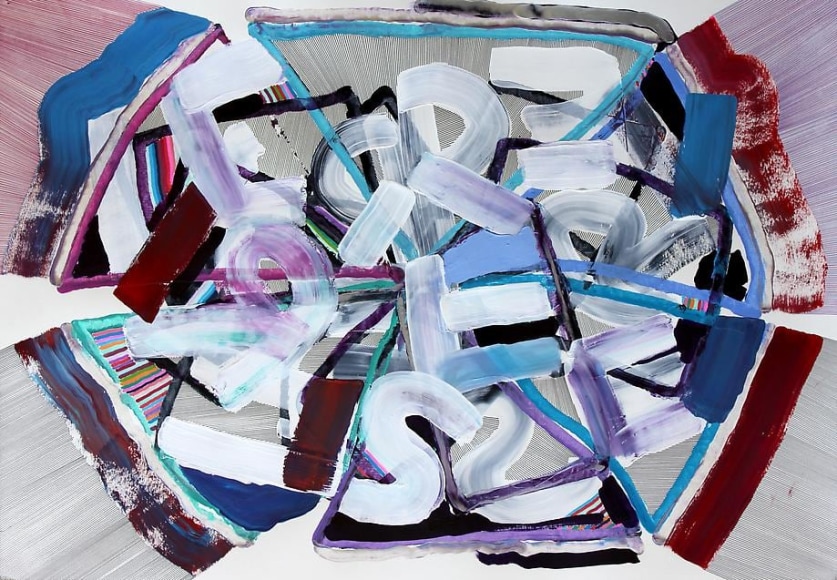 Utilizing John Rajchman's notion of "operative formalism," Feodor Voronov (b. 1980, St. Petersburg) creates optical terrains that splinter and twist around the central image of a word. Voronov investigates the nature of repetition in both form and language by painting harlequin patterns that are at once organic and methodical - an analysis of the human experience that borders on familiar but is clearly unique. Voronov toys with the formal aesthetics of the written word, evaluating its psychological roots in symbolism à la Magritte, while also embellishing upon the intrinsic habit of mark-making in the vein of Cy Twombly.