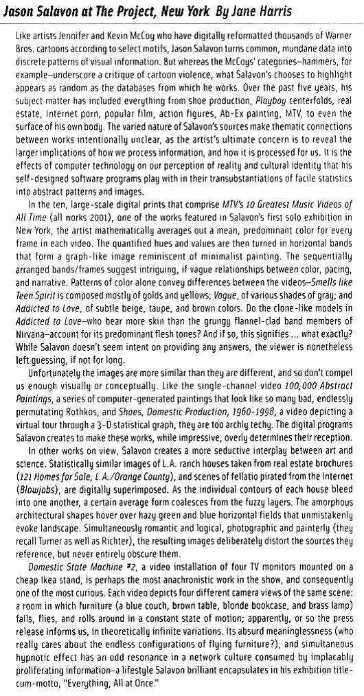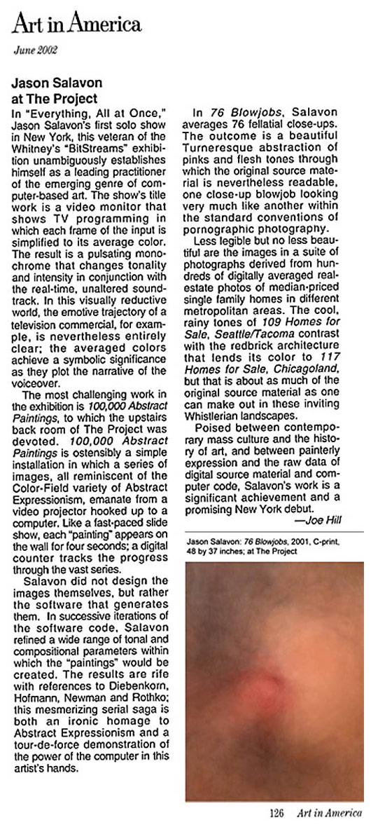 Using software processes of his own design, Jason Salavon generates and reconfigures masses of communal material to present new perspectives on the familiar. Though formally varied, his projects frequently manipulate the roles of individual elements derived from diverse visual populations. This often unearths unexpected patterns in the relationship between the part and the whole, the individual and the group. Reflecting a natural attraction to popular culture and the day-to-day, his work regularly incorporates the use of common references and source material. Often, the final compositions are exhibited as art objects – such as photographic prints and video installations – while others exist in a real-time software context.
