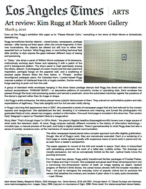 Matter is neither created nor destroyed in Kim Rugg's work, but surgically, strategically repurposed. Rugg reconfigures familiar printed materials: here newspapers, magazines, and maps; previously also postage stamps, comic books and cereal boxes. By altering their forms and tweaking or altogether eliminating their legibility, she slams on the visual brakes, forcing a closer, slower inspection of objects we typically look through rather than at. The raw materials of her enterprise give up their transparency and functionality as information delivery systems to become instead sculptural interpretations of those same systems. They sacrifice one type of authority but assume another.