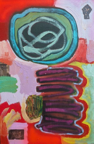 Disparate elements (of mark, motif, image and gesture) allow for a networking of possibilities, a web akin to the nature of the Mind, that reflect the problem-solving and pattern recognition search of our innate way of existing in the world. Any inherent cohesion is hermetic, oft times illogical, but is reformulated by the active participation of the mind viewing it. This is not an acceptance of the ’subjective’, as an all-is-acceptable interpretation, but rather a realism-based acknowledgment of the non-linear and cultural set of the brain’s ordering processes. They are built through an intuitive initial phase that is then 'modified' by formal concerns and the addition of these elements. My approach is somewhat akin to curating - selecting separate, disparate motifs and approaches and assembling on to the picture plane to form a new web of ideas. These aspects remain isolated and existential, although in a relationship with each other, expanding their potential and giving rise to complex structures of understanding, questioning and possibility . I incorporate elements from real life, in the form of badges, patches and photo transfer images onto the surface as a reference to existing sub-cultures and realities.