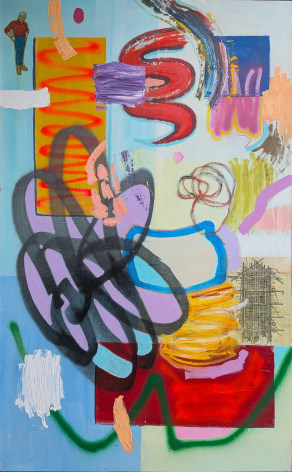 They function as discursive formations between images, gestures, signs, symbols, in a fluid, contingent and multi-layered network of meanings and possible relationships. They incorporate, on the same picture plane, a mixture of historical reference, auto-biography and sub-cultural content in a shifting soup of knowledge, conjecture, opinion, guesswork, and the irrational. This interpenetration occurs when the histories of abstract mark making, an ongoing developing iconography and sub-cultural motifs are placed in relationships on the picture plane. The ‘arena’ of the picture plane (although implying one section of an infinite extension via hinted at grids), is a site of conflict for a merging of emotional states, conceptual ideas, memories and autobiography, where the notion of knowledge and understanding is contested. The connections between ‘events’ within that space create potential new relationships of meaning that accept uncertainty and the possibility of failure.