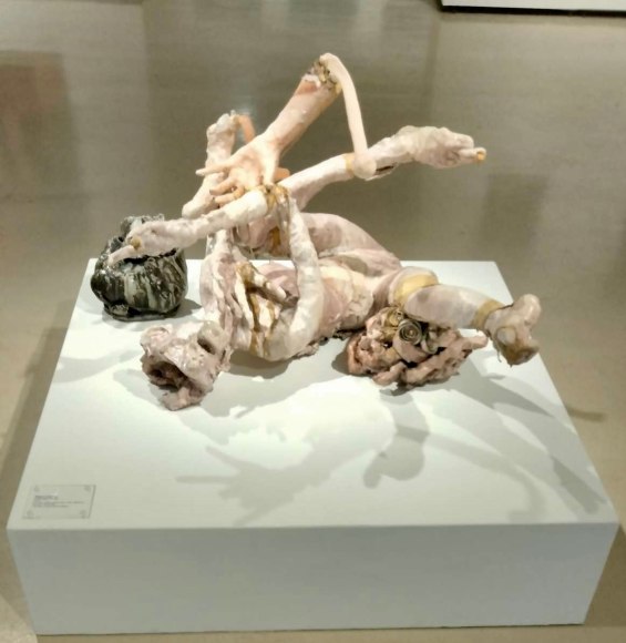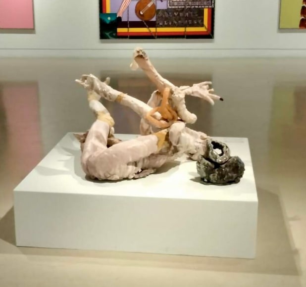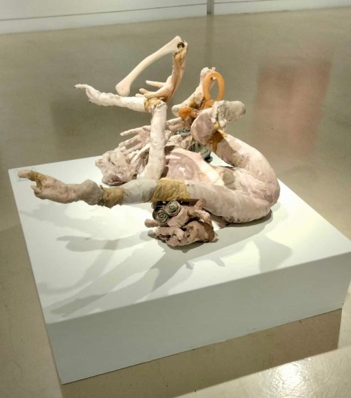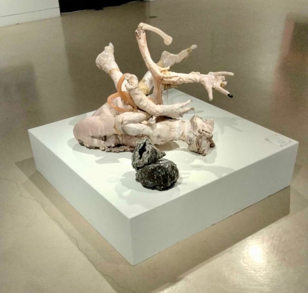 Using a traditional sculptural format (the monument), Meghan Smythe captures contradicting extremes within human gesture: intimacy and brutality, beauty and ugliness, or the lewd and tender. In her attempt to achieve an "elegant vulgarity," she encapsulates moments that define our mortality in unanticipated ways; oftentimes toeing the delicate line between erotic and macabre tendencies that give way to life, and ultimately death. Glass, ceramic, and concrete are woven together in an elaborate, orgy-like web of body parts and organic artifacts, as if suddenly cast with Pompeii-like circumstances. Like excavated antiquities or fossils, Smythe's ceramic compositions allude to the cyclical nature of civilization - a dramedy in which all of the players are subject to conquest and demise.