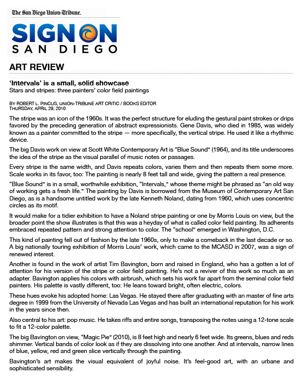 Tim Bavington (b. 1966, England) received his BFA from the Art Center (CA) before making the permanent move to Las Vegas, where he completed his MFA at the University of Nevada, Las Vegas (NV). His work is included in the public collections of Fredrick R. Weisman Collection (CA), Crocker Art Museum (CA), Honolulu Art Museum (HI), Albright-Knox Art Gallery (NY), Creative Artists Agency (CA), Joslyn Art Museum (NE), Museum of Contemporary Art, San Diego (CA), Portland Art Museum (OR), United Talent Agency (CA), Vivendi Universal (CA), Palm Springs Art Museum (CA), Denver Art Museum (CO), The Museum of Modern Art (NY), Nora Eccles Harrison Museum of Art, Utah State University (UT) and the McNay Art Museum (TX). He has exhibited at LeeAhn Gallery (Daegu), Jack Shainman Gallery (NY), Galerie Jean-Luc & Takako Richard (Paris), Space Gallery (London), Museum of Fine Arts (MA), Laguna Art Museum (CA), Museo de Arte Contemporaneo de Buenos Aires, and the Texas Fine Arts Center (TX) among others.