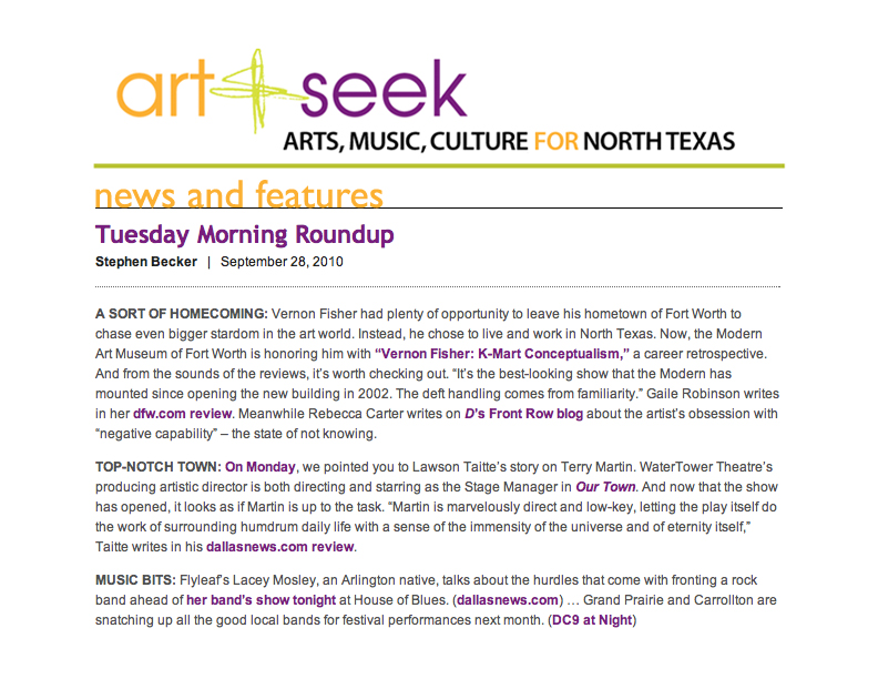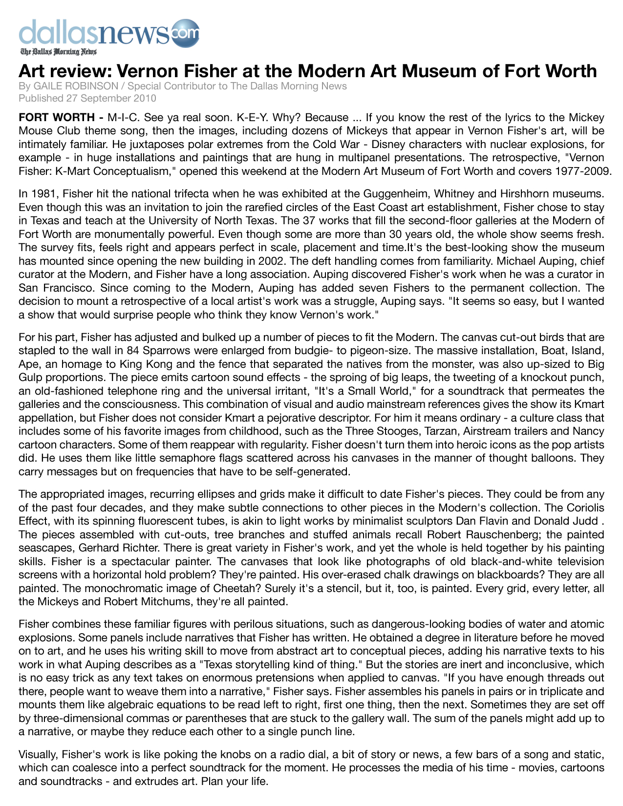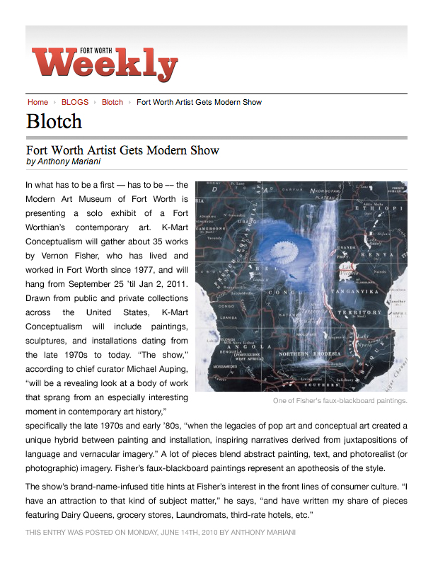 The art of Vernon Fisher is included in the collections of more than 40 museums across the globe, such as the Hirshhorn Museum, Washington, D.C., Art Institute of Chicago, Modern Art Museum of Fort Worth, Phoenix Art Museum, Museum of Fine Arts, Houston, San Francisco Museum of Modern Art, Solomon R. Guggenheim Museum in New York and the Museum of Contemporary Art Chicago. The most important museum installation is in the collection of the famous Museum of Modern Art in New York.