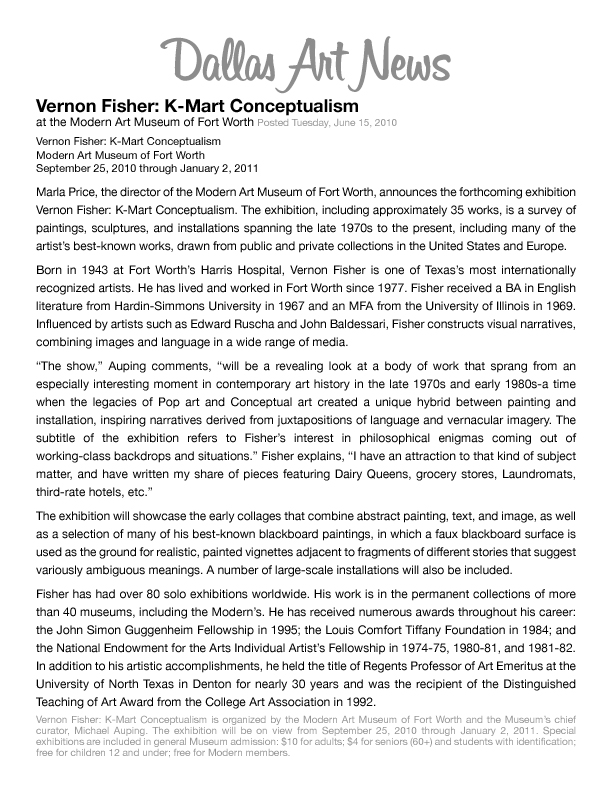 Vernon Fisher was born in 1943 in Fort Worth, Texas. He studied English literature at the Hardin-Simmons University, where he received a BA in 1967. Vernon got his MFA in 1969, from the University of Illinois. As a true Fort Worth child, Fisher was spent his entire life in his hometown, where he enjoyed appreciation as one of the Texas’s most internationally recognized artists.