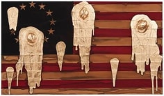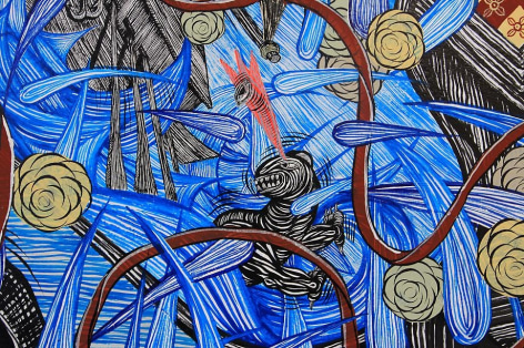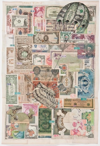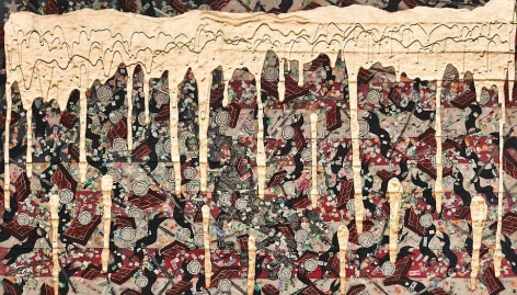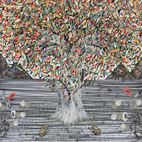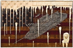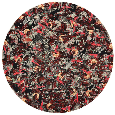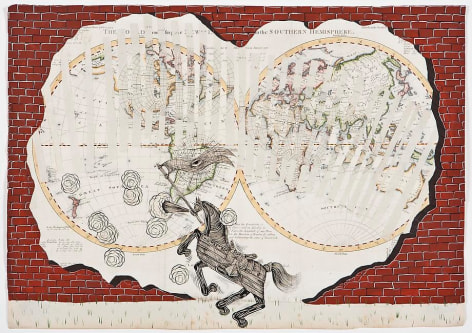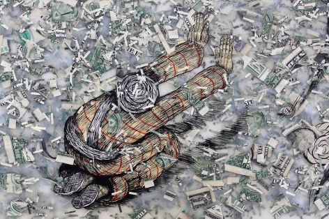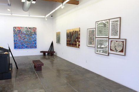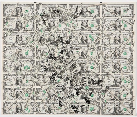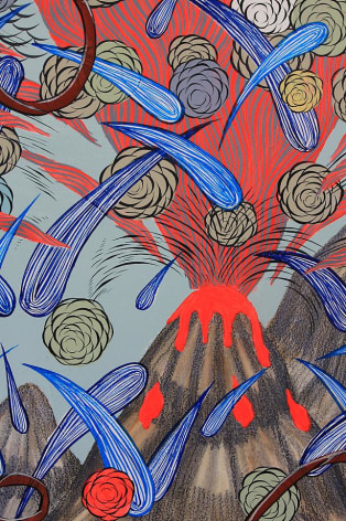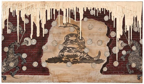 Sourcing aesthetic inspiration from 15th Century German map making and Indian miniature paintings, Andrew Schoultz's frenetic imagery depicts an ephemeral history bound to repeat itself. In his mixed-media works, notions of war, spirituality and sociopolitical imperialism are reoccurring themes, which shrewdly parallel an equally repetitive contemporary pursuit of accumulation and power. "Fall Out" primarily investigates the notion of the monumental, both in its commemorative personification of power structures, and the increasingly prodigious consequences of our egocentric consumption. In these works, undulating bodies of water recall the devastating realities of global warming, while American flags stamped with the ubiquitous "Made in China" inscription question our domestic authenticity. Schoultz facilitates a dialogue that is both topical and ageless, and prompts the viewer to navigate a physical and visual space suggestive of our cyclical parochialism. While his illustrated world seems one of chaos and frenzy, Schoultz also implies a sense of alluring fantasy and whimsy - a crossroads vaguely reminiscent of the modern world.