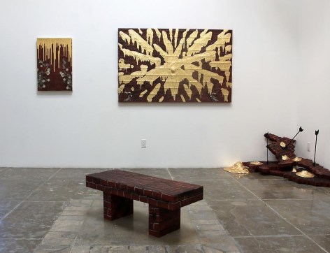 Mark Moore Gallery proudly presents "Fall Out," an inaugural solo exhibition of paintings by San Francisco-based artist, Andrew Schoultz. In this exhibition, Schoultz translates the motifs in his kinetic two-dimensional works into a real scale three-dimensional installation – presenting an interrelated combination of painting, sculpture, drawing, and collage. Referencing the social constructions and implications of a public civic center, museum, or church, Schoultz invites the viewer be seated on his handcrafted benches, and be immersed in the ramifications of our contemporaneous globalization.