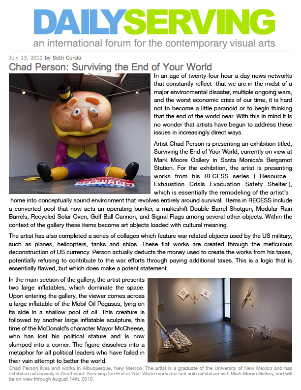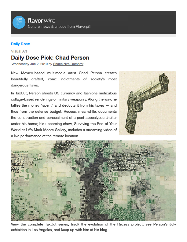 "New Mexico-based multimedia artist Chad Person creates beautifully crafted, ironic indictments on society's most dangerous flaws." – Shana Nys Dambrot, Flavorwire (2010)