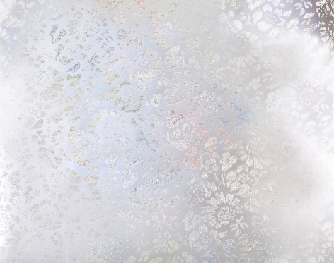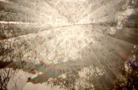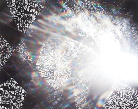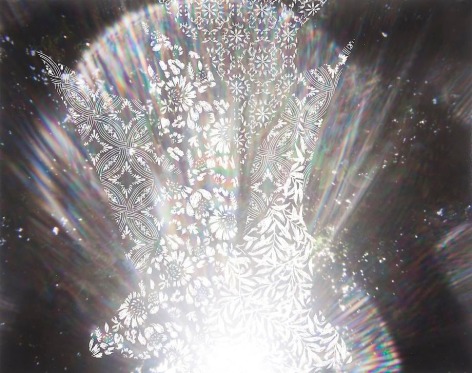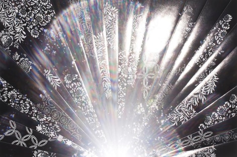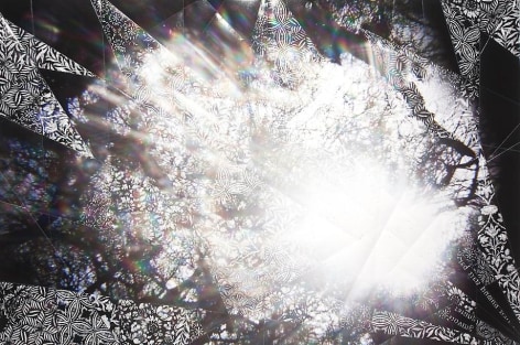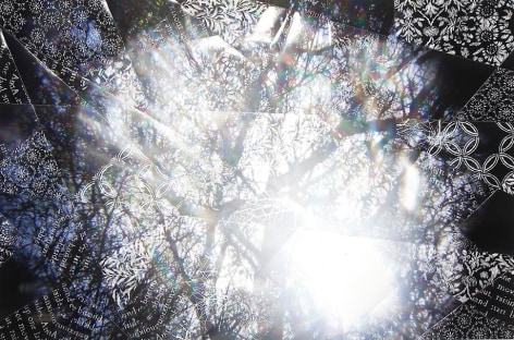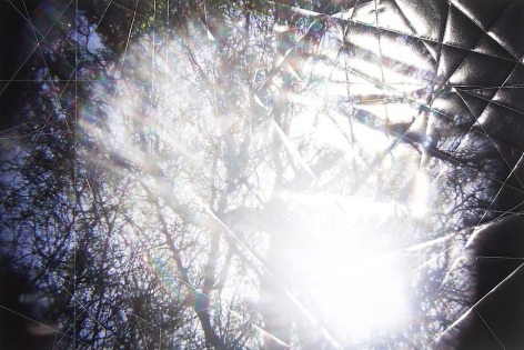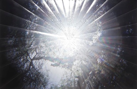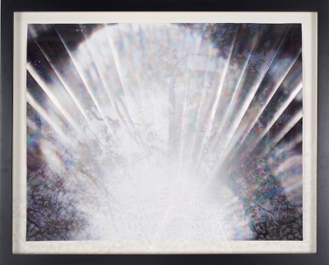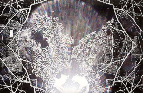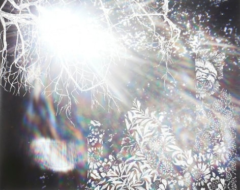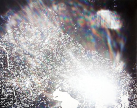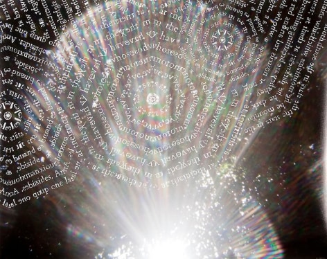 Countering the idea of the mass-produced novel and pervasive e-book, GRFALWKV harkens back to the handmade origins of bookmaking, imitating the illustrative qualities of crafted manuscripts while also recalling the visual language of contemporary materiality, literature, and design. Employing techniques of spray painting, collage, and fountain pen drawing, each page is meticulously transcribed by hand. Through this methodical process, Russell invites us to ruminate on the affects of mortality. The first chapter recalls scenes from Antichrist movies of the Cold War era, with illustrations alluding to environmental catastrophe. The next chapter delves into Edmund Burke's essay on terror as the ruling principal of the sublime, while the following chapter offers an imaginary glimpse into the aftermath of a nuclear blast. The fourth chapter “Dead Art Star” - deals with the art world as a catastrophic event in which ideals are traded and sold to the detriment of the artist's sense of self. The final chapter brings the text back to photographic seeing by offering brief descriptions of mundane scenes, and creates mental images that act as stages for potential traumas. Supplementary to the book are Russell's photographs of lens flares, rife with intricately scraped patterns and figures upon their surfaces. With a razorblade, Russell gouges stylized explosions and fragmented scenes of an apocalyptic aftermath into his images, creating a world in which animals have returned to re-inhabit the rubble left by these detonations. Simultaneously referencing death and rebirth, Russell's visual and written narrative guides us through the captivating, volatile nature of transience.