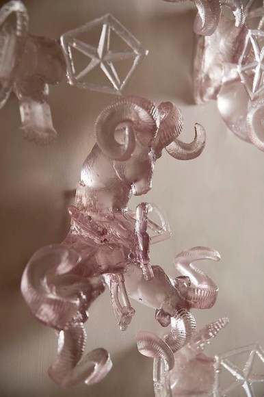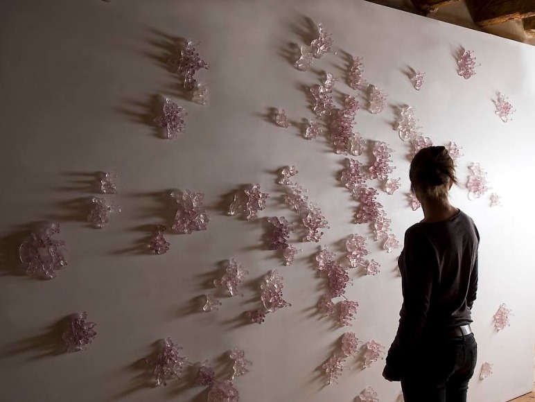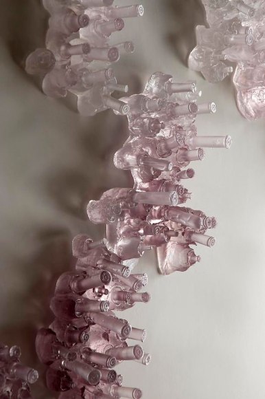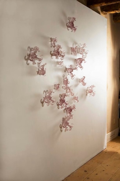 Long’s initial interest in phenomenology lead her to a practice dedicated to the physical world of corporeal experiences, namely light, space, and color. Through the transparent materiality of cast glass, wax, crystal, and plastic, the artist is able to imbue luminescence and color into cast appropriations of ubiquitous objects and detritus she serendipitously finds during her desert walks. By way of recasting litter such as rearview mirrors, truck hood ornaments, and bullet casings, each sculptural form transcends its manmade material qualities and becomes an artifact of nature, seemingly eroding and transforming into celestial rock formations. The artist then mounts these objects to a wall in groups that create immersive environments, evoking a cave-like world in which the discards of the everyday morph into immaculate gemstones. The resulting installations of light and color creates a intimate space in which the viewer may bypass the analytical world of language into a realm of corporeal experience and pure sensory pleasure. Through Long’s skillful alteration of space and context, each light-infused object functions as proof that in the end, there is only nature.