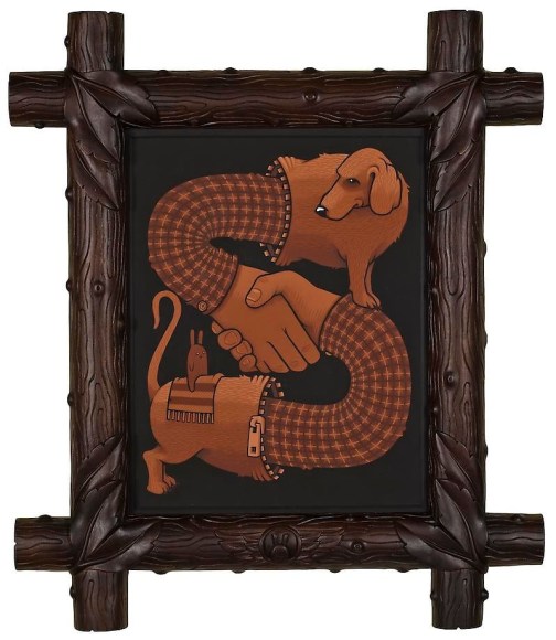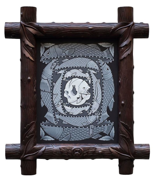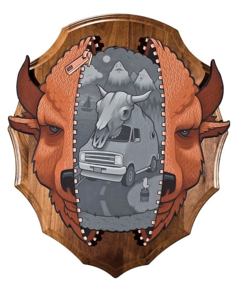 In this exhibition, Fish encourages us to question the concept of value. As a society, we have become increasingly fixated on acquiring prize possessions. Be it the newest technological gadget, or a "trophy piece" for a collector's art collection, we have been conditioned to pursue "the best" at all costs. In letting the thrill of the chase dictate the cost of our objectives, we find ourselves progressively dispassionate about ideological or noncommercial worth in favor of competitive gain. Fish confronts this predatory attitude by inviting us to enter the hunter's mind, and take inventory of his spoils. The artist's trademark sculptural paintings appear as prizes on a cabin's walls, rife with imagery pertaining to modern conquest and obsession. Fish intimates that such voracity can meet an ominous end, but with the layered, congenial plot of a parable. With the guidance of the artist-as-narrator, the "Hunting Trophies" on display bespeak an unfolding saga - complete with unprecedented risk, obscure protagonists, and capricious villains – of which we may never learn the lesson.