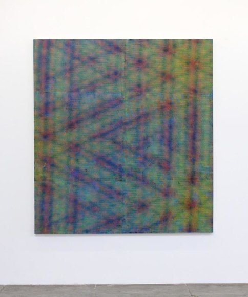 Existing at the nexus of science, art, and technology, Oppermann's work is rife with paradox. While the initial patterns are generated digitally on the computer, the paintings themselves are created by hand using a stencil and rollers. Oppermann’s approach is at once rational and analytical, yet also intuitive and hands-on. She employs a variety of painterly and gestural techniques that rough-up and humanize her compositions. “I want my work to be organic, something that's made by a person and is not perfect, something more dynamic,” she says. In this way, the artist creates images that appear to emulate the digital, while remaining deeply ensconced within the decidedly un-technologic practice of applying layers of paint to a surface. Beyond the pigments and the patterns, she utilizes perception itself as a medium in her work. Sharp color contrasts through the overlapping rasters electrify her moiré patterns, creating paintings that elicit physical sensations in the viewer. The interference effects are the immaterial result of the human brain's inability to process the overwhelming visual information, and guarantee that no two viewings of an Oppermann composition will be the same. The viewer continues to encounter new and disorienting visual "glitches," such as illusions of motion, vibration, or a shifting perspective. Accordingly, Oppermann's work operates at a supra-perceptual level, in which the sensory reward of her images is the result of interfering with the viewer's ability to perceive them.