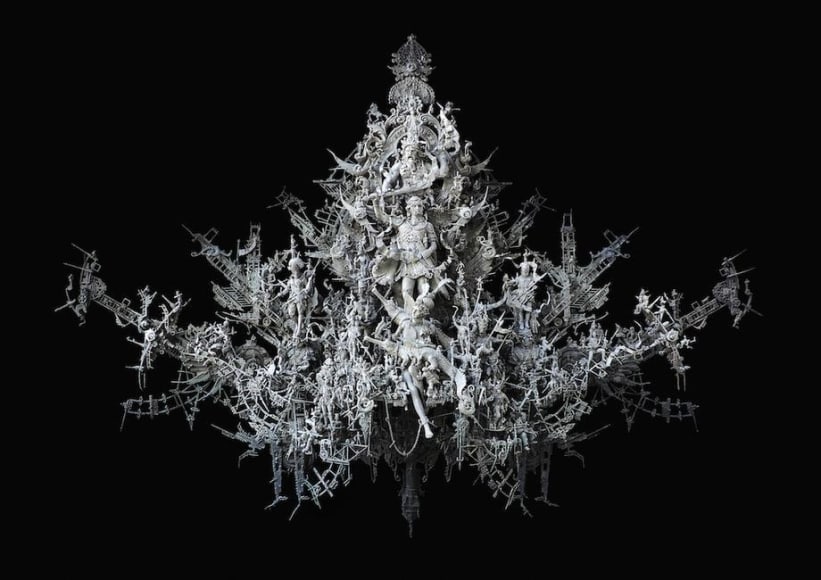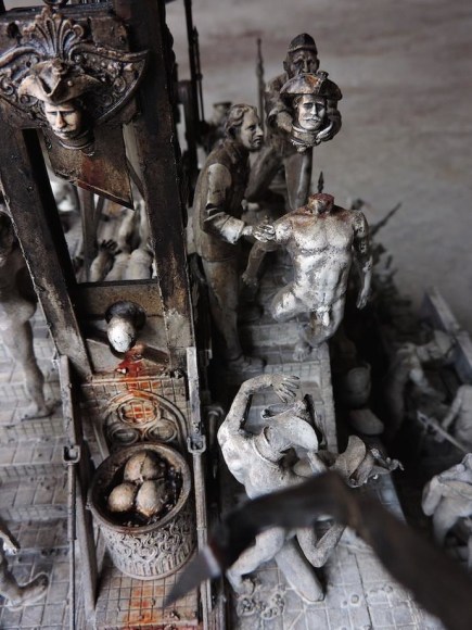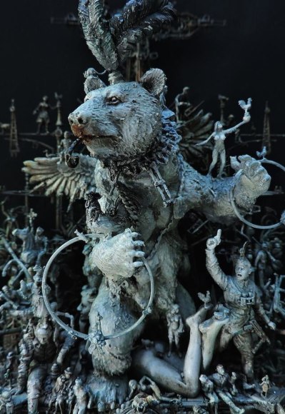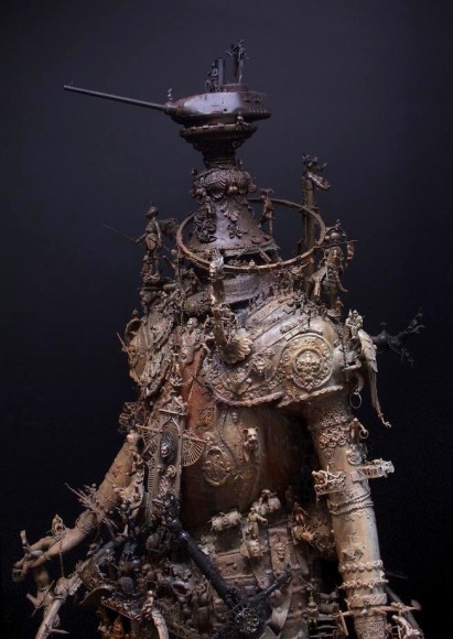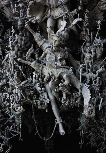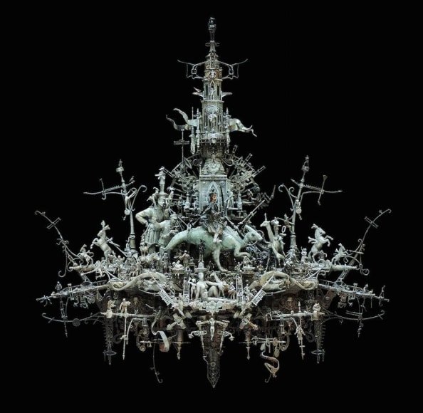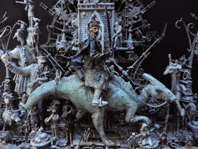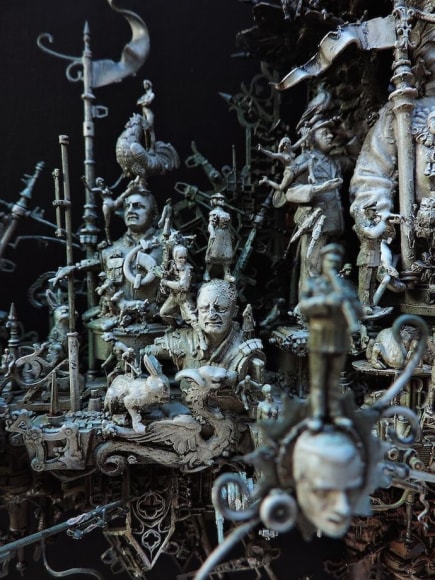 Kuksi’s ornate compositions call to mind the excessive intricacies of Art Nouveau or Baroque aesthetics. From a distance, these sculptures are deceptively decorative, but upon closer inspection Kuksi's grotesque realities emerge. In some works, central figures preside over mounting chaos below; infinitesimal creatures, soldiers, and machinery collide with their larger counterparts, and forge a warscape void of time and place. In others, Kuksi achieves a precise structural equilibrium in which his minute armies become a single enormous figure – as if the proverbial Trojan Horse is operated by its most aberrant inhabitants. Reminiscent of Hieronymus Bosch’s “Garden of Earthly Delights,” Kuksi’s characters inhabit a world rife with sin, corruption, and tragedy; an existence not so alien to our own.
