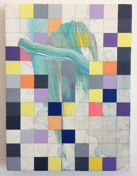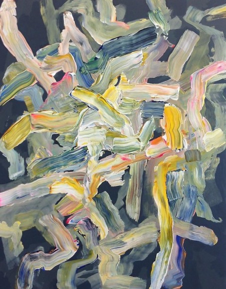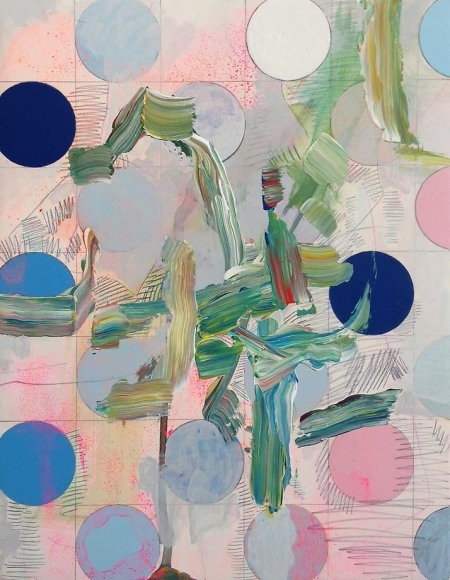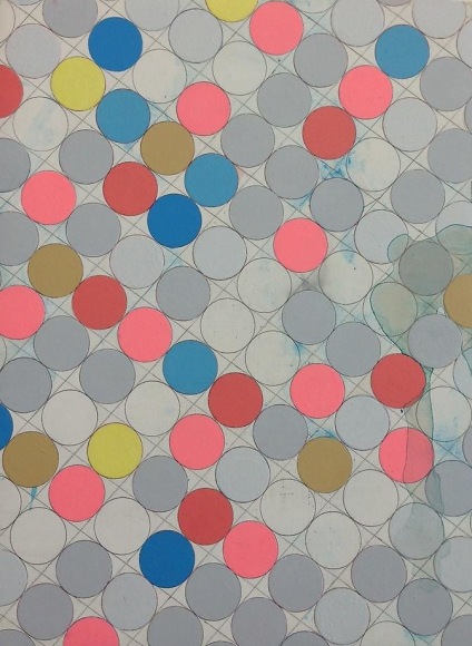 Since the war between "fine art" and "design" broke out - a distinction increasingly diminishing in the advent of accessible technology - context has been the dividing faction between the two designations. Through his intimate canvases, Lester Monzon acts as an analog commentator on this quarrel, and poses the question of whether or not such denotations are truly relevant or purposeful in art making. Historically, Monzon's colorful gesticulations conceal sections of rigid patterning, a tête-à-tête between so-called "abstract expressionism" and "hard-edge abstraction" that implies a gentle lampooning of the taxonomic tradition behind art "movements." Monzon upends the formalism and segregation innate to the fine art world, and fabricates a composite genealogy of painting - a pithy resolution to an otherwise vapid debate. Monzon's luscious brushstrokes slyly creep into a Hirst-esque field of dots or Noland-like plane of stripes, like the resurrection of a once-declared dead practice through a satirical hand. In this show, Monzon applies this critique of contextual art practices and assimilation to mark-making in public spaces; be it graffiti on tiles in a public bathroom, stains on the sidewalk, or the popularized notion of "street art." In questioning the validity of one set of forms and social framing over the other, Monzon facilitates a larger dialogue about the dissemination of status, and the dominant voices of endorsement.