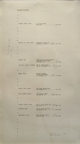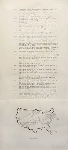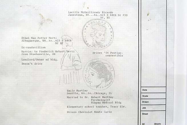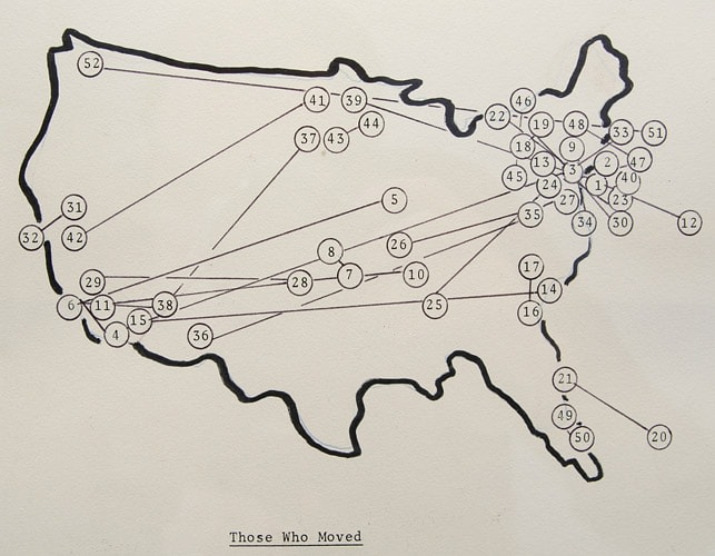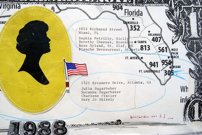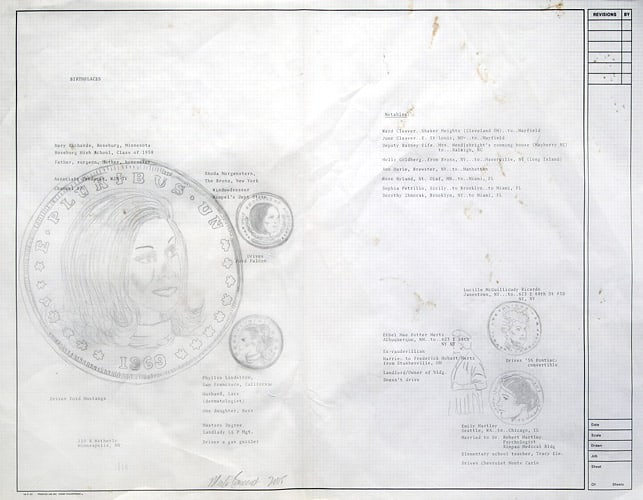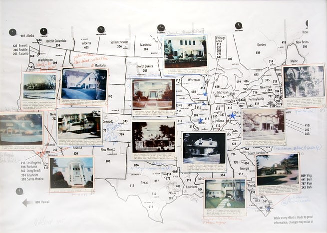 Mark Bennett uses the same cast of characters from his series of blueprints of the television homes of families such as the Bradys, the Flintstones, and Lucy and Ricky Ricardo in a new series of unique works on paper. In these new drawings, Bennett imagines scenes such as Bewitched star Samantha Stevens gracing the cover of the one hundred dollar bill, while concurrently plotting in loving detail the geographical movements of America’s favorite television stars as they fictionally moved to different cities across the United States during their television run.