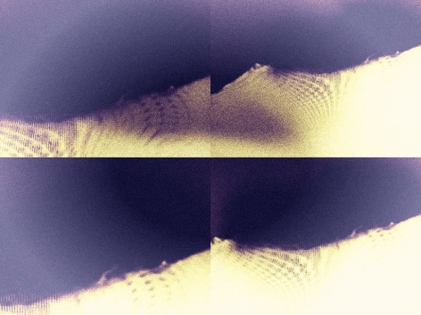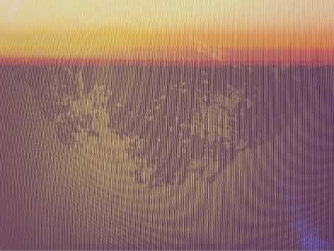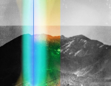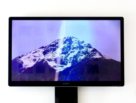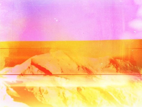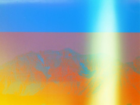In these photographs, Umbrico allows the disorienting effects of the iPhone’s gravity sensor and the hallucinogenic effects of more than 500 camera app filters to break up, blend, distort, and de-stabilize the majestic peaks and summits that appear in the original photographs. In these images, photo grain, dot-screen, and screen resolution collide, creating undulating moiré patterns and pixilation that reference a viewing reality mediated through the digital screen. An overwhelming number of filters in these user-friendly smart-phone camera apps simulate the mistakes of analogue film photography. The light leak and chemical burn filters are especially absurd in the context of the smart-phone, where the impossibility of holes, gaps, dark volume or liquid necessary to produce these effects, stands in direct opposition to the apparatus simulating them. Umbrico processes a single mountain image though every “light leak” filter she can find for her video, "Mountains, Moving: Light Leaks and Chemical Burns (time lapse)." If light is the first and foremost element of analogue photography, here digital algorithm renders nostalgically fetishized synthetic light to reference clichés of the spiritual light of enlightenment.