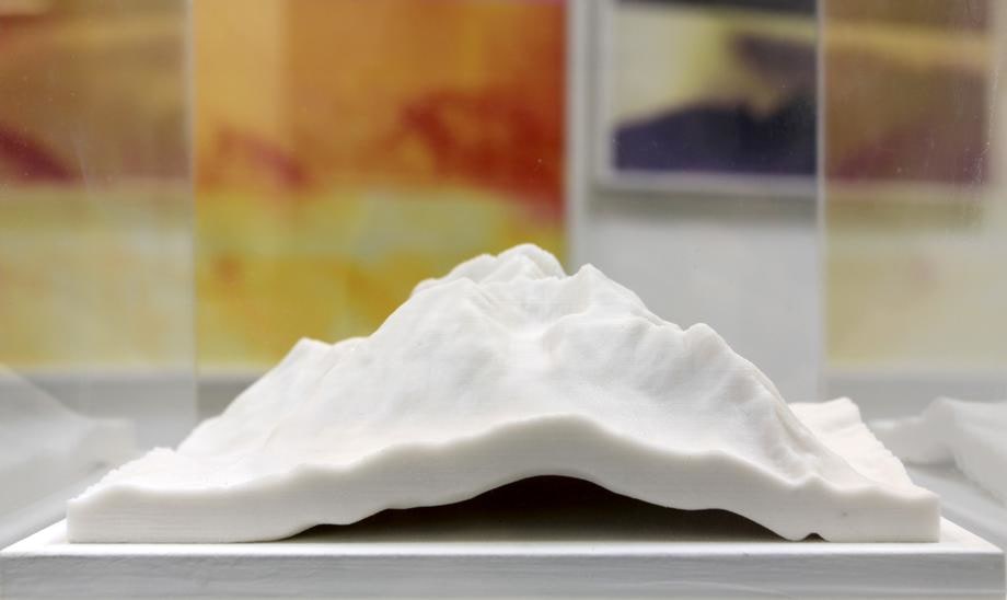 In "Master Copy (Mount Moran)," Umbrico takes one of the images of a mountain in the exhibition as a starting point in her collaboration with Thomas Storey, who’s work for this project explores Google Earth’s agenda of translating satellite photographs of the earth’s surface into the tiled texture-mapped model we’ve come to know as earth online. In this collaboration, Storey extracted the Google Earth data for the geo-location of Ansel Adams’ photograph, The Tetons and Snake River, to create a 3D model of Mount Moran pictured in it. Here, the ancient stable form of the mountain, first captured as a singular monument in a photograph (a process which begins with natural light), moves in multiple iterations through infinitely reproducible and distributable code on the web (the manufactured light of pixel and 3D model), to end with the image of Mount Moran on Google Earth as an independent object through the 3D printing of its associated image data. Umbrico and Storey suggest an equivalency here - if the individual photographers were once the masters of how we viewed the natural world, for better or for worse, we now view the world through a master Google lens. Taken from monumental earth through digital code, the mountain ends in reconstituted earth again - a small ceramic specter of a mountain.