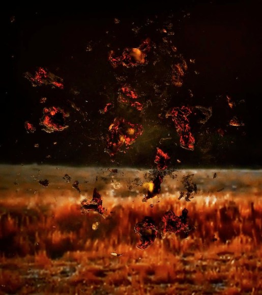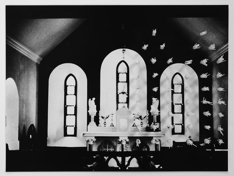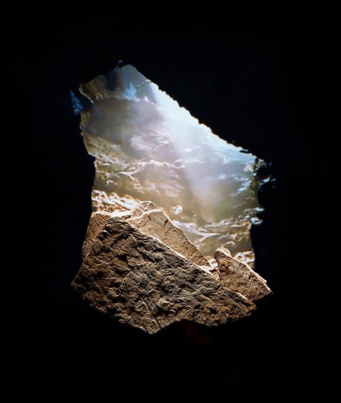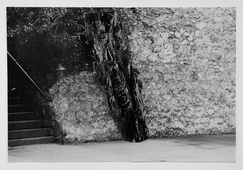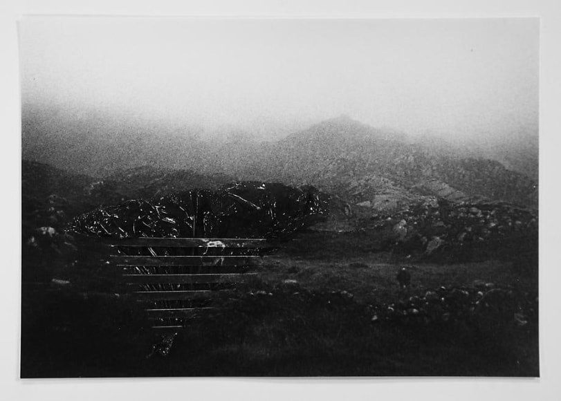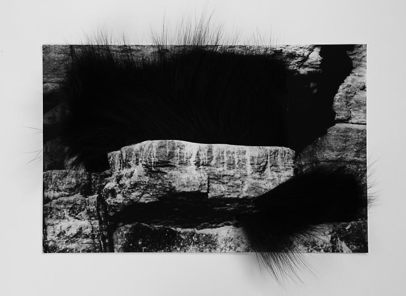 "Telltale," a series of digital photographs, was composed by staging everyday materials against screen imagery from film, advertising, surveillance footage and the Internet. Washburn works from a screen placed on the floor like the flatbed plane of an abstract canvas and subtly, but also almost violently, alters the implications of the source imagery. The backgrounds, often eerily empty landscapes, are used to set the scene in their original context. However, Washburn diverts those narratives to her own outcomes through the use of materials such as hair, wool, bubble wrap, bottle mouths and burning embers. The resulting photographs subvert the disembodied experience of watching a screen, and ultimately return us to its surface as an unlikely point of contact and physical orientation. Teasing out tensions between constructed and straight photography, the images are clearly theatrical but also present evidence of the ambiguity of place and presence in an increasingly virtual world. Washburn also debuts a related series of collages and assemblages, "Here About." The work began in response to a group of found vintage silver gelatin prints. Washburn’s cuts, piercings and sculptural additions layer the prints with a myriad of histories beyond their own and question the authority of the photograph to capture a particular moment. As with "Telltale," her orphaned materials, ranging from fur to tennis balls, are aggressively detached from their original function and replaced by an animate, almost totemic, and at times uncanny presence. Washburn concludes with two drawings on vellum paper from her series "Walking Back the Cat," which again refer to screen imagery in a decidedly performative way. Reiterating the importance of touch, the drawings show her hand’s attempt to make sense of the spiraling catastrophe depicted in several looped sequences from the film Earthquake about the end of Los Angeles. The results, delicate but dogged, wrest an apocalyptic spectacle onto an intimate surface layered with the slower time of a real body in action.