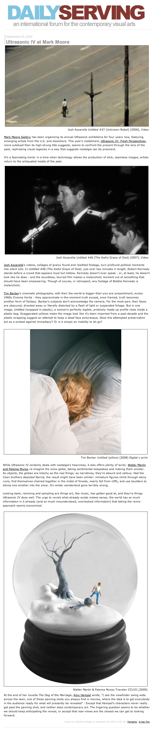 Be it Matthew McGuinness' manipulated photos - which confront the disjointedness between physical and emotional disasters - or Martin & Muñoz's petite sculptural microcosms of dystopia, Fresh Perspectives exhibits work that grapples with the elemental framework of authentic experience, which oftentimes borders on the surreal as much as the commonplace. While Mario Ybarra Jr.'s installation examines the institutional dictations of socio-cultural "norms," Josh Azzarella's videos explore the power of context in the authorship of memory – both of which illuminate the individual encounter of communal events. These perceptions of realness can be rooted in the fantastic or the pragmatic, as well as their intersections – an acute point Tim Barber captures in his photographs of the beautifully mundane and stark Americana. As each of the five artists showcased in Ultrasonic IV reference a distinctive verisimilitude, they share a collective interest in addressing the relativity of experience in perception.