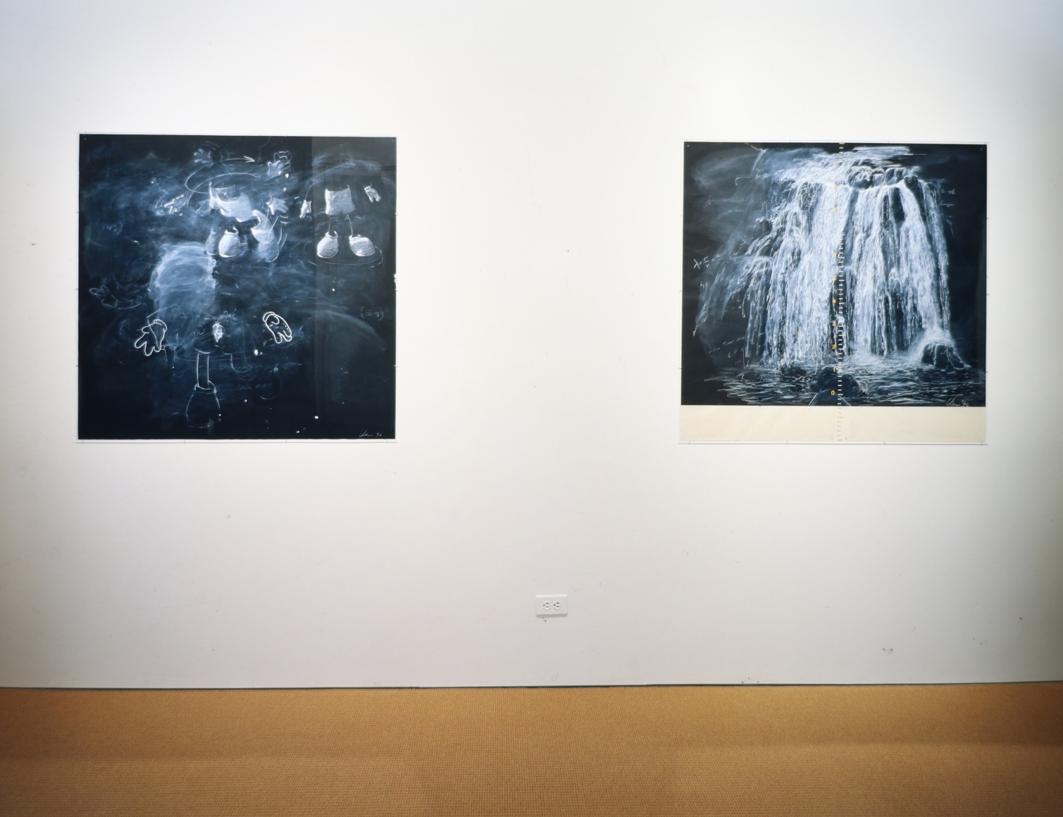 VERNON FISHER RENDERS THE ACTIVITIES OF THE BRAIN; UTILIZING A “BLACKBOARD” GROUND SIMILAR TO THOSE FOUND IN CLASSROOMS, FISHER’S IMAGERY IS BEST LIKENED TO THOUGHTS THAT OCCUR, ARE REGISTERED, AND PASS INTO THE SUBCONSCIOUS; COMBINED WITH PAINTED “ERASURES”, FISHER’S DISPARATE IMAGERY AND TEXTS VISUALIZE THE MERCURIAL NATURE OF MEMORY AND DESIRE.