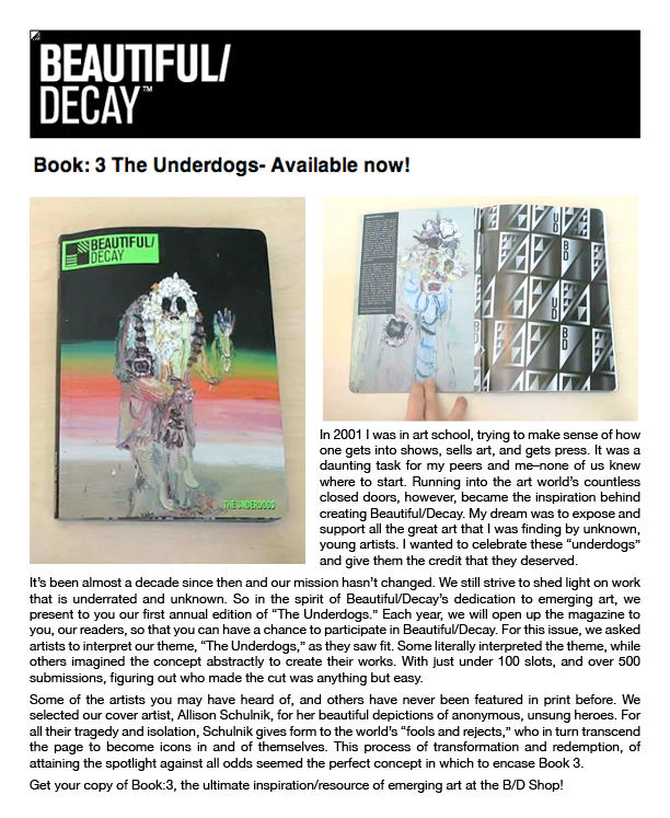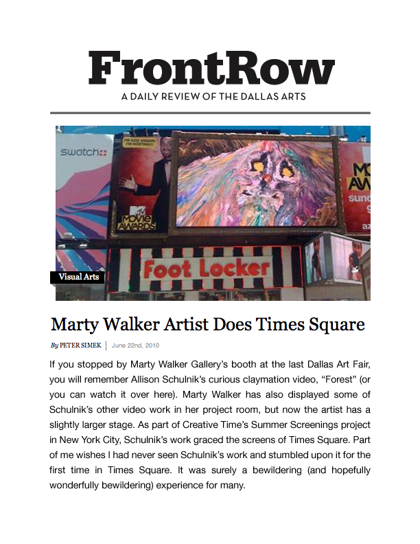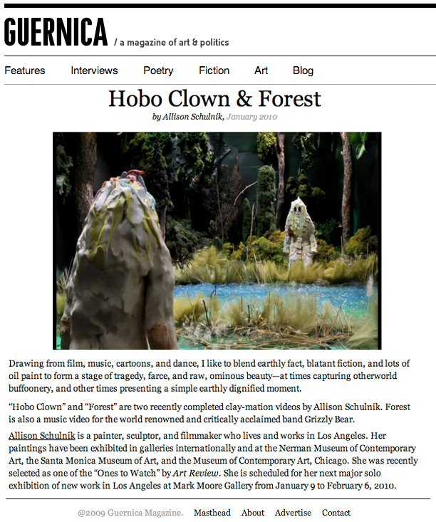 Schulnik has been making animated films since she was 17. Her films have been included in internationally renowned festivals and museums including the Hammer Museum, Los Angeles, LACMA, Annecy International Animated Film Festival and Animafest Zagreb. She received “Best Experimental Animation” at the Ottawa International Animation Festival and Special Jury Prize at SXSW FIlm.