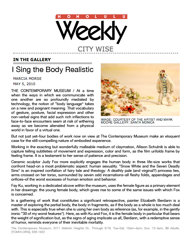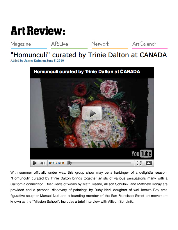 Solo exhibitions include the Wadsworth Atheneum Museum of Art, Hartford, CT; Laguna Art Museum, Laguna Beach, CA; Oklahoma City Museum of Art, OK; Nerman Museum of Contemporary Art, Overland Park, KS; Mark Moore Gallery, Los Angeles; ZieherSmith, New York, NY; and Galeria Javier Lopez & Fer Frances, Madrid. Schulnik's work is in the public collections of the Los Angeles County Museum of Art; Museum of Contemporary Art San Diego; Santa Barbara Art Museum; Museé de Beaux Arts (Montreal); Laguna Art Museum; The Crocker Art Museum; Wadsworth Atheneum Museum of Art; and The Albright-Knox Gallery; Marjorie Barrick Museum (University of Nevada Las Vegas)- to name but a few. She lives and works in Sky Valley, CA.