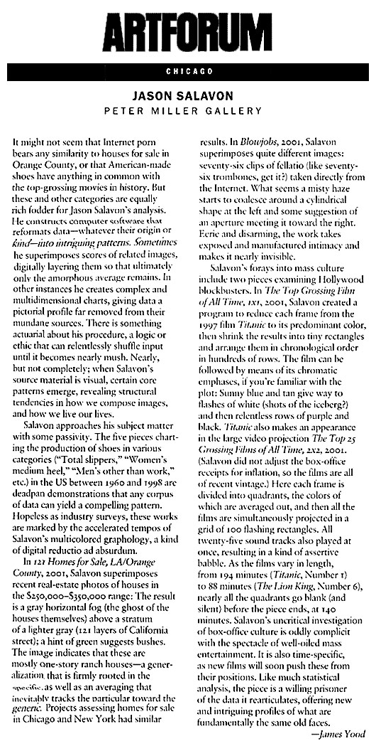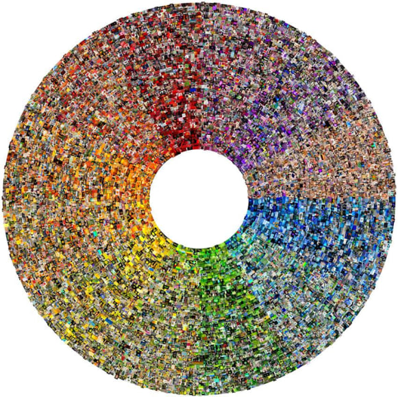 Using software processes of his own design, Jason Salavon generates and reconfigures masses of communal material to present new perspectives on the familiar. Though formally varied, his projects frequently manipulate the roles of individual elements derived from diverse visual populations. This often unearths unexpected patterns in the relationship between the part and the whole, the individual and the group. Reflecting a natural attraction to popular culture and the day-to-day, his work regularly incorporates the use of common references and source material. Often, the final compositions are exhibited as art objects – such as photographic prints and video installations – while others exist in a real-time software context.