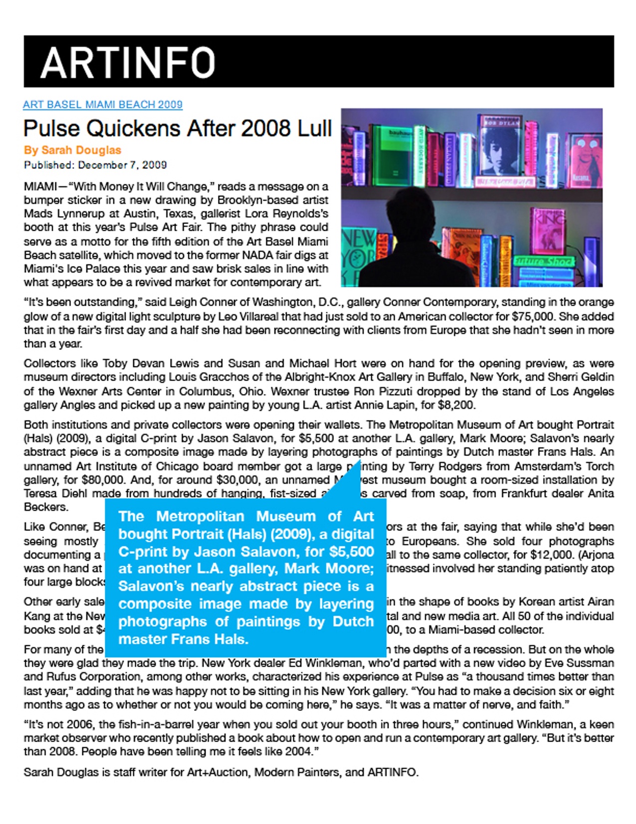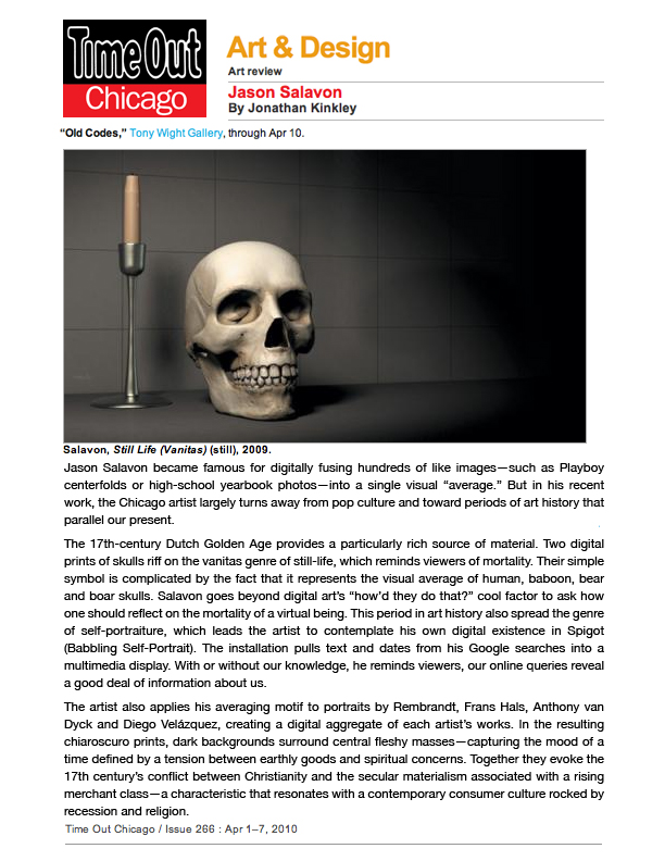 Born in 1970 in Indianapolis, Salavon obtained his MFA from Art Institute Chicago (IL). He has had solo exhibitions in New York, Chicago, Los Angeles, Columbus, Washington D.C. Houston, Seattle, Cologne, Seoul, London, Geneva, Basel and Paris, among others, and been featured in exhibitions at venues such as the Metropolitan Museum of Art (NY), Smithsonian Institution (D.C.), and Los Angeles County Museum of Art (CA). Salavon's work has been acquired for the public collections of the International Center of Photography (NY), Whitney Museum of American Art (NY), Los Angeles County Museum of Art (CA), Museum of Fine Arts (TX), Museum of Contemporary Art (IL), the Metropolitan Museum of Art (NY), Columbus Museum of Art (OH), Cleveland Museum of Art (OH) and more. In 2013, he was named one of the "50 Under 50: The Next Most Collectible Artists" by Art + Auction Magazine. Salavon lives and works in Chicago, IL.