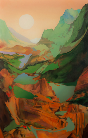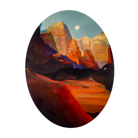Nehrbass’s romantic vision of the Western landscape is informed by Hudson River School painter Albert Bierstadt, the German-American artist known for his sweeping vistas that, in the late 1800s, encouraged migration to the American West.