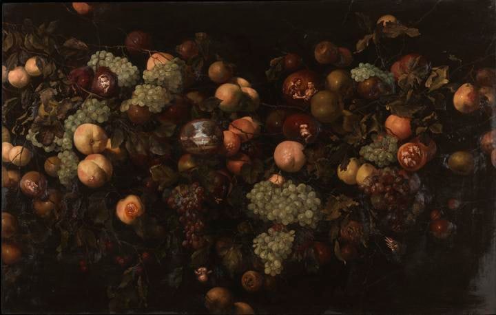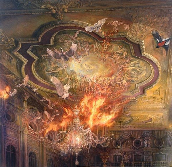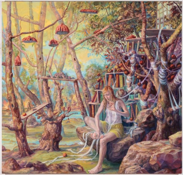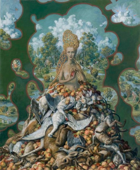 Akin to Magical Realism, Julie Heffernan's lush self-portraiture utilizes a myriad of art historical references to present a sensual interior narrative, a self-allegory whose half- hidden political agenda is the literal background of the paintings. The dark, Grimm fairy tale-like undercurrent transforms her aristocratic, operatic portraits into a contemporary vanitas or memento mori, acting as both a stylized fantasy and a Bosch-like warning.