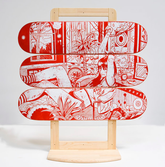 Kenichi Yokono employs woodblock methodologies to address the stark contrast between traditional and contemporary Japanese culture, as well as the convergence between Western and Eastern popular cultures. Influences from manga, anime, horror movies, and other stereotypical aspects of Japanese pop culture merge to present iconic images of buoyant kawaii (or "cuteness") in contrast with "the horror of everyday life," according to the artist. Also referencing his longtime interest in American skate and surf culture, Yokono's carvings often depict a "punk rock" sensibility that speaks to a desire to break outside of customary Japanese sensibilities. Although functioning woodblocks, Yokono's works are devoid of the conventional prints that have historically served as the final art object; rather, the woodblock itself is the art object —a subtle pushback against orthodox Japanese art-making that bridges past and present cultural realities. Similarly, Yokono demonstrates an interest in the Western art historical canon, often including elements of Dutch vanitas or still life painting to draw a parallel between popularized and underrepresented notions of mortality. As explored in more historicized art movements, Yokono embellishes upon the Japanese fascination (and celebration) with the delicate line between life and death, beauty and vulgarity, or normalcy and the bizarre. His meticulous craft maintains the primacy of the handmade object, through which the artist retains a tangible presence. These multiple oppositions in Yokono's work result in pieces that are rife with social critique and irony.