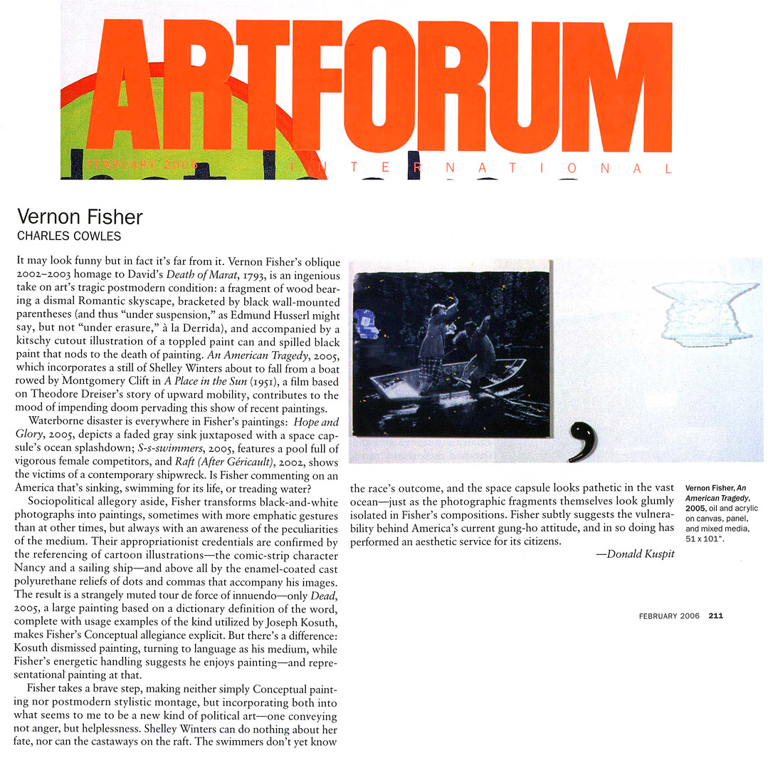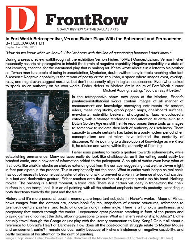 The art of Vernon Fisher is included in the collections of more than 40 museums across the globe, such as the Hirshhorn Museum, Washington, D.C., Art Institute of Chicago, Modern Art Museum of Fort Worth, Phoenix Art Museum, Museum of Fine Arts, Houston, San Francisco Museum of Modern Art, Solomon R. Guggenheim Museum in New York and the Museum of Contemporary Art Chicago. The most important museum installation is in the collection of the famous Museum of Modern Art in New York.