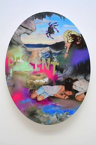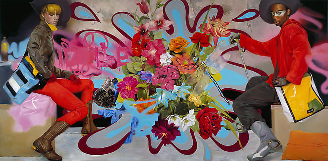 Mark Moore Gallery is pleased to introduce new work by the innovative collaboration Asgar/Gabriel. Asgar/Gabriel's large-scale paintings are postmodern mise en scène where linear narrative is lost; where the figurative and the abstract, image and text exist simultaneously and vie for the viewer's attention. These dislocated canvases ironically serve to locate a contemporary audience who is perfectly at ease with the disjunctive over-stimulation of a world saturated by the media and the image.