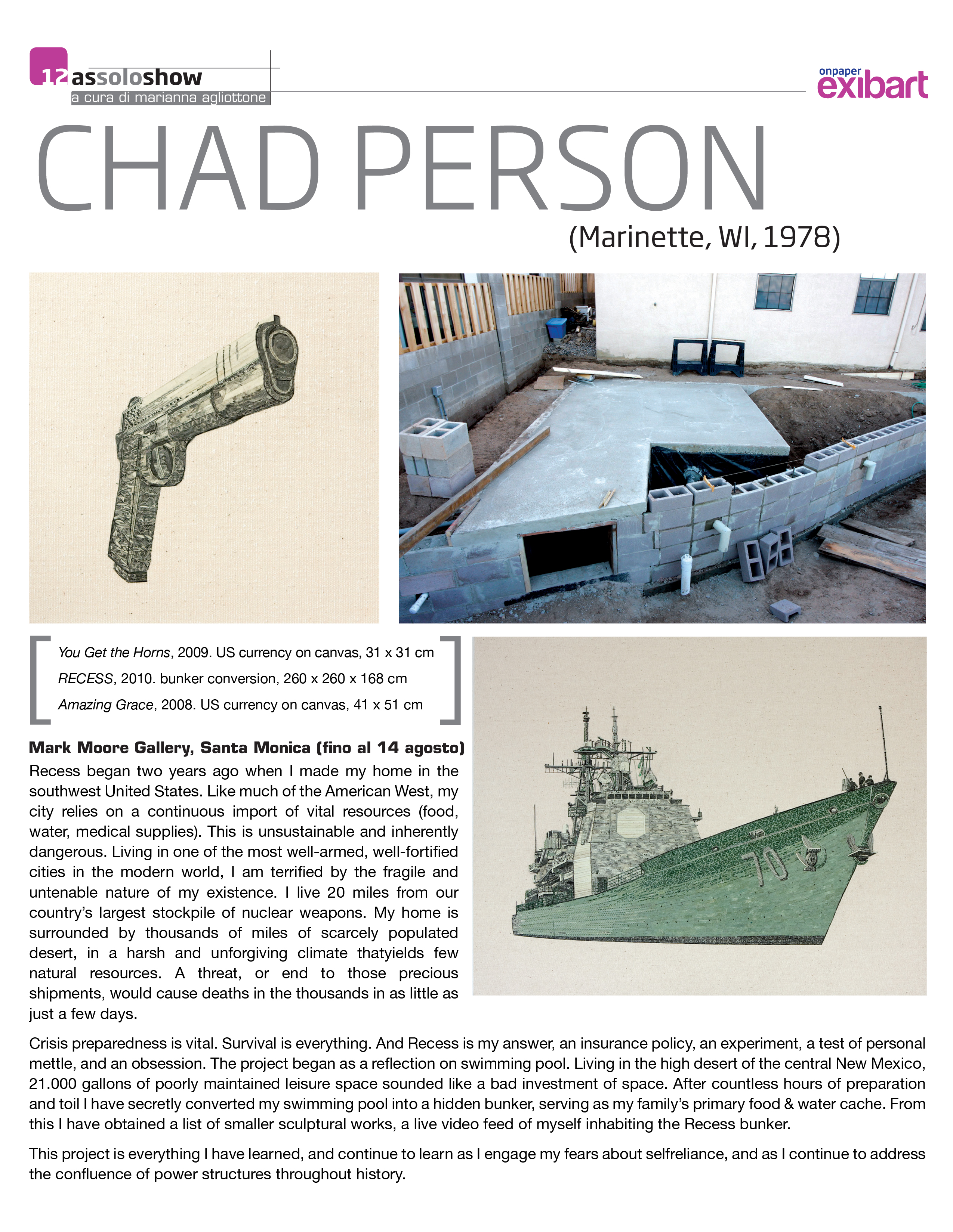 "New Mexico-based multimedia artist Chad Person creates beautifully crafted, ironic indictments on society's most dangerous flaws." – Shana Nys Dambrot, Flavorwire (2010)