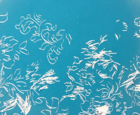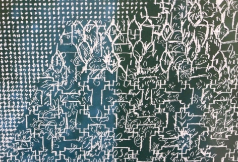The space of the photograph, already illusory, begins to alternate between visual systems. Repeating patterns are used as stand-ins for personal and abstract sets of values. Unlike Victorian flower codes, with rigid definitions assigned to specific flora, the meanings of patterns are individual and fluid. They line interiors, envelop bodies and provide a glimpse of an ersatz infinity—the valiant attempts at replication falling ever short of the real thing. In the drawings, patterns are chopped into awkward, intersecting ribbons, free flowing signifiers jammed against each other and into the shapes of mountain peaks. The result is both destructive and revelatory—the patterns bringing to life the photographic subject’s inner world, or suggesting at the vast potential therein.