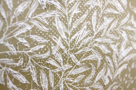 For his second solo show with the gallery, the artist has created a series of manipulated landscape photographs. Using a colored veil over the camera lens, the original prints are fuzzy impressions of forest scenes—seemingly underwater, awash in blood, or encased in amber. Russell then scrapes, gouges and scratches the surface of these prints with intricate, overlapping swaths of pattern. The individual marks are violent disruptions to the pristine surface of the print, a romantic impulse invading the field of mechanical reproduction, revealing the bright white glow of the paper's inner core.