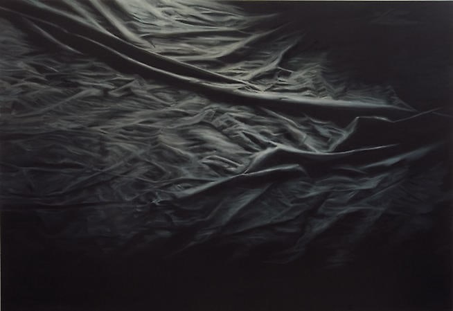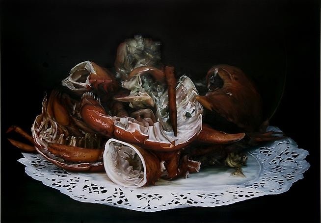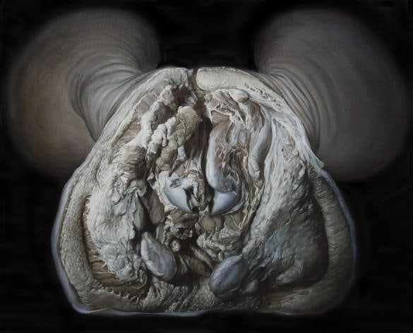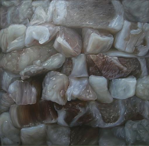Mark Moore Gallery is pleased to present new paintings from Belgian artist Cindy Wright. Wright's large-scale portraits and still-lifes embrace oppositions, the distance between which might be crossed in a few steps or might be too blurry to even define. Wright forces her viewer to scrutinize often-unconsidered yet vital minutia; skin, fat, ripples in fabric or internal organs. Yet her claustrophobic focus offers a false intimacy; in order for the images to remain recognizable, the viewer must remain at a distance; upon closer inspection the canvas pleasingly dissolves into a collection of abstract brushstrokes. Paradoxically, despite this painterly presence, her use of photographs as source material strips her works of any tenderness. They retain a detached and sterile quality, their function a clinical observation. Nevertheless Wright's work displays no awkwardness on behalf of these conundrums; rather her canvases are effortless displays of art historical awareness, their solemn beauty at once familiar and disquietingly innovative.