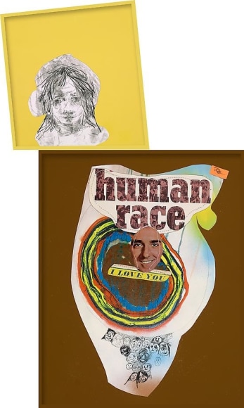 Handmade Love, 2014 / mixed media on paper with assemblage sculpture / three elements: 49 x 13 x 13 inches, 17.5 x 14.5 inches