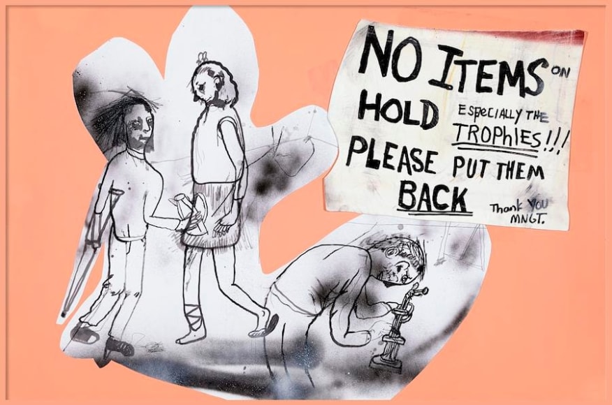 Mark Moore Gallery proudly presents "Open to the Public,” an expansive exhibition of mixed-media drawings, assemblage, photography, video, and installations by the Clayton Brothers. Consisting of brothers Rob and Christian Clayton, the duo examines the mythos, culture, and visual language of an archetypal second-hand store located near their studio. Drawing from their observations of the venue and its visitors, the brothers entwine their independent approaches, styles, and palettes into works that operate as co-authored epics – which are rife with reoccurring motifs, gestures, and figures. The end result is a drama of shared experiences that fuse the concept of self with that of the communal, both in subject matter and practice.