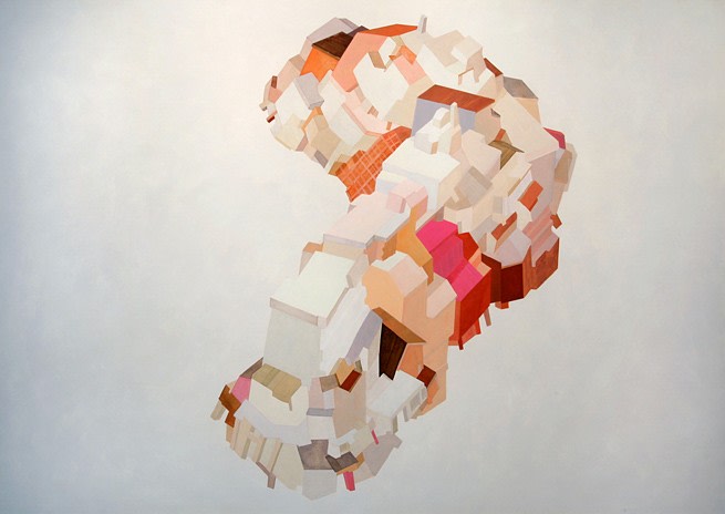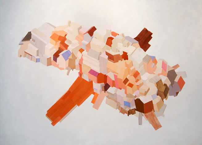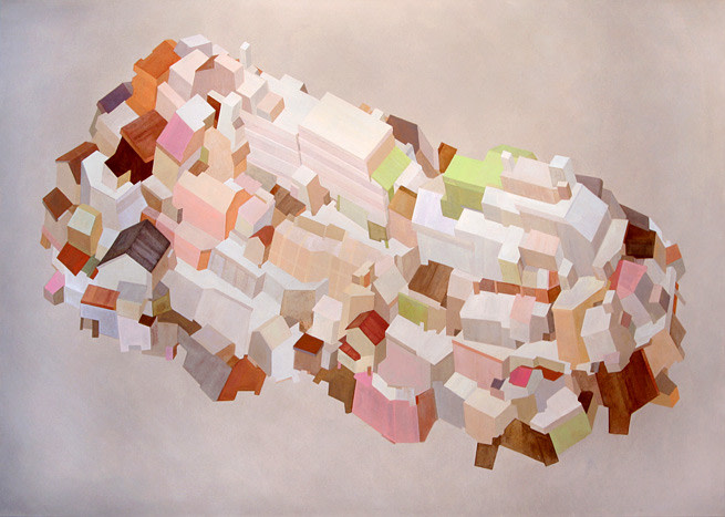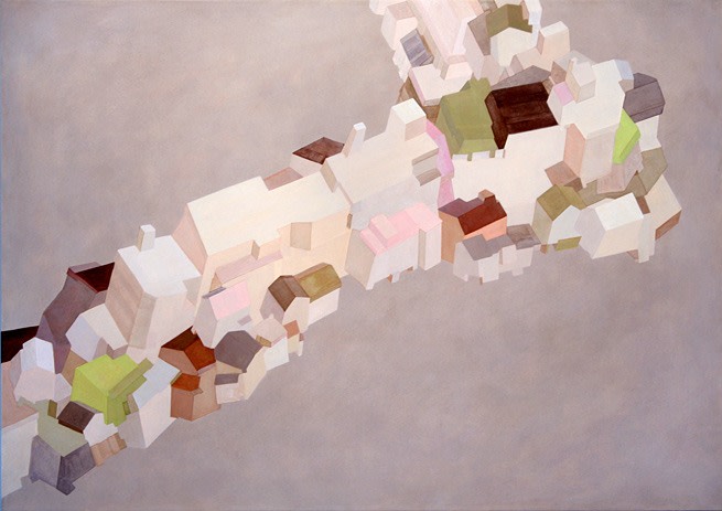 "The day became white and everything in the town separated. Houses sailed off like ships onto unknown seas. The people had new hope to discover freedom on their voyage.?" Daisuke Ueno describes the groups of houses in his paintings as floating vessels, removed from their structural foundation in search of a new sense of place. Houses stacked on houses and carried by wings made of rooftops, Ueno's paintings construct new communities within each canvas, using pale tones of pink, orange, gold, yellow and red to create an atmosphere of peace and tranquility for their anticipated journey.
