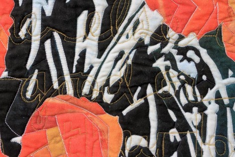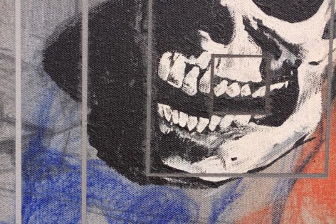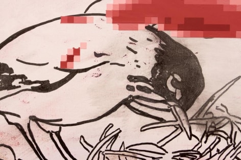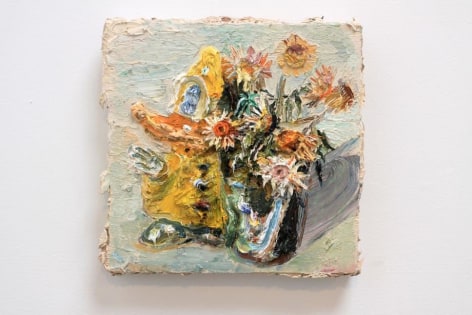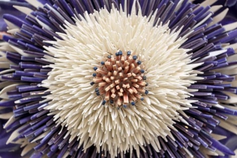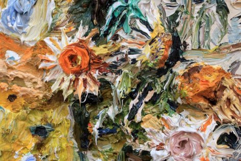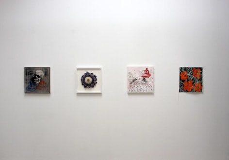 Considering this simple framework, incredibly diverse approaches and techniques were employed, given the practices of each artist. Certain individuals approached the theme from an art historical perspective, focusing on the perception and tradition of still life, landscape, and pastoral imagery, as can be seen in the works of David Klamen and Allison Schulnik. Gallery newcomer Zemer Peled contributes a sensuous wall-mounted ceramic sculpture ornately assembled from shattered pieces of blue and white porcelain, while Kim Rugg's work is an intricate quilted rendition of the "newsworthiness" of Warhol's own imagery – both testaments to the increasing lack of handcraft in recent contemporary art. Penelope Umbrico also confronts issues pertaining to image authorship and the exclusivity of the art world by "appropriating" Warhol's image from Art.com, and up-ending the famed artist's own interest in mass produced icons.