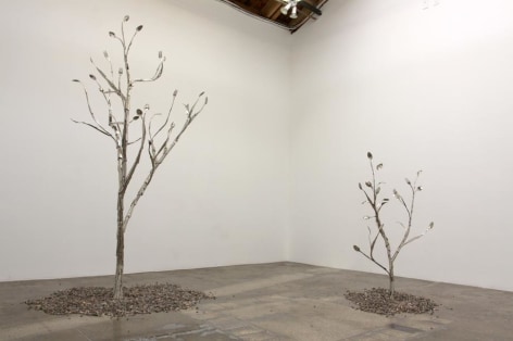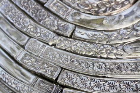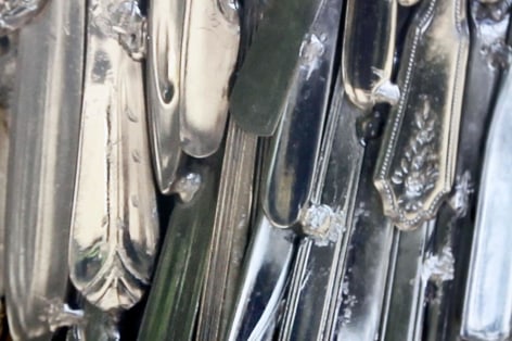 In the sculpture "Grafted Settings (Tree)," Shin investigates the history and cultural connotations of flatware. The practical, utilitarian function of the utensil serves as a cross-cultural common ground facilitating the basic human need for sustenance. Yet historically, flatware has become loaded with divisive cultural significance, evoking associations embedded with connotations of class, etiquette, and privilege. This complexity is similarly evident in her use of the tree as an object representing both utility and idealized beauty. In combination, the tree and flatware suggest a harmonious co-existence of culture and nature, while softly referencing their mutual fragility. Shin’s vivid photographs capture these domestic materials transformed into various sections of the tree. Forks, spoons and knives form delicate branches, the curves of annual rings, and textured layers of bark. These images speak to family rituals of the home, and - like a setting at the table - suggest memories both personal and communal.