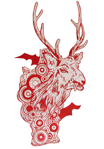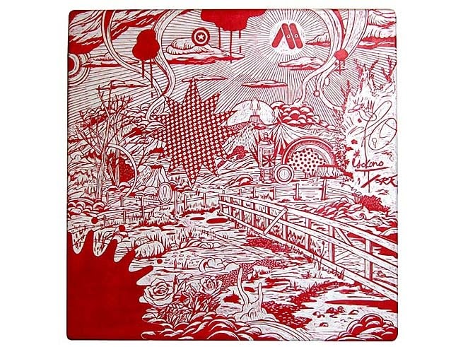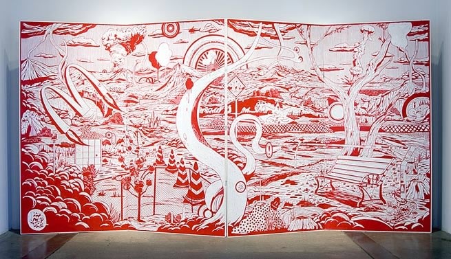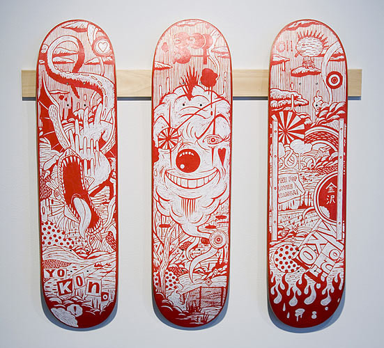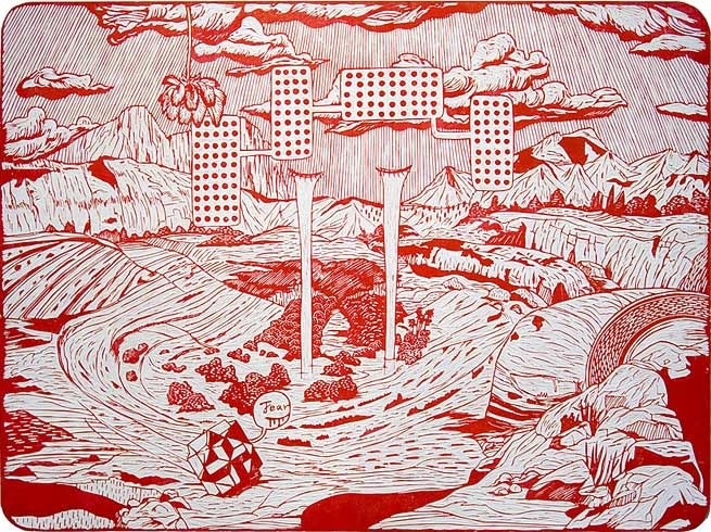 Mark Moore Gallery is pleased to present new works by innovative Japanese artist, Kenichi Yokono, in the Project Room. Yokono produces intricate and complex wood blocks, whose aesthetically pleasing blood-red and white surfaces belie their disturbing details. His works highlight the subtle conflict between the "normalcy" of everyday appearances and the darkest recesses of human imagination - fueled by horror movies, Manga and monsters – that constantly threaten to rise to the surface. This unsettling quality evokes the darker, sinister elements of traditional Japanese culture that have largely been overwhelmed by the simplified, cutesy, plastic cartoon characters of contemporary Japanese pop-culture. By installing the wood block itself as the finished piece, Yokono subverts its traditional function, transforming something that is traditionally a genesis, into a finality. He also eliminates the possibility of copies, and therefore any notion of "mass production", again subtlety referring to and undermining Japanese pop-culture.