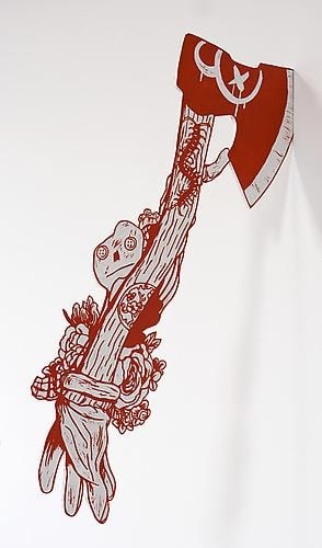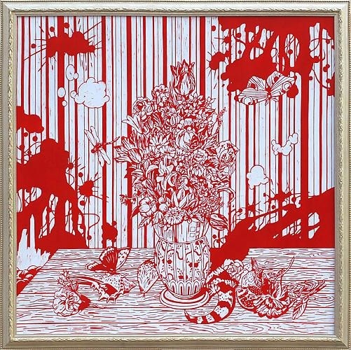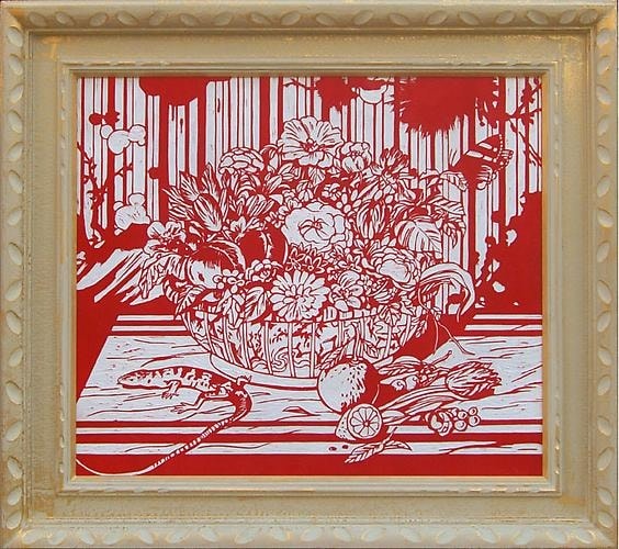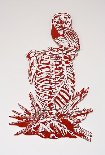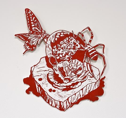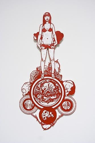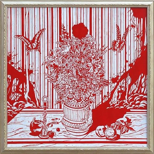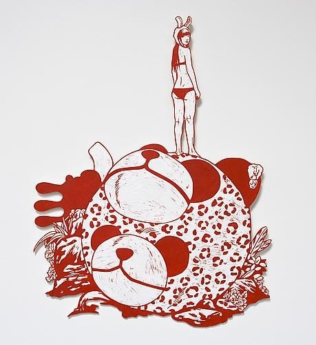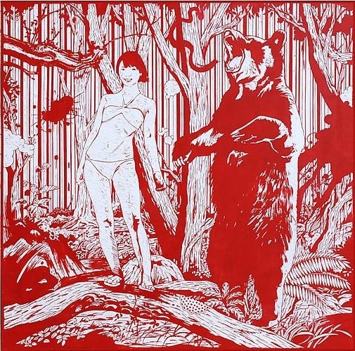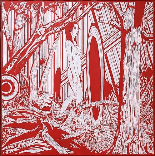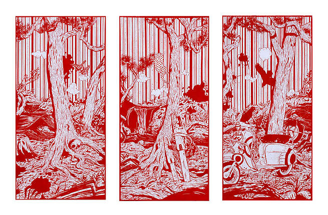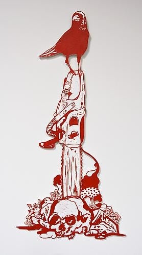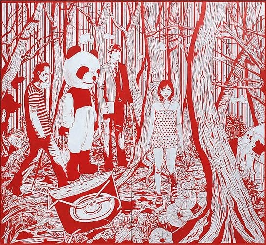 Mark Moore Gallery is pleased to present highly anticipated new work from Japanese artist Kenichi Yokono. Yokono presents his highly detailed, meticulously carved woodblocks, finished in stark white and contrasting blood red, as an end product rather than producing multiple prints. In doing so his sophisticated work encompasses and speaks of the traditional past of his native land as well as its contemporary pop culture, while addressing internationally relevant questions of globalization and consumerism. The stark, minimal colors belie these complex themes and the often unsettling nature of his subject matter. Fueled by horror movies and Manga, his works frequently edge towards the sinister, depicting unidentifiable scenes that invite the viewer to imagine the worst, letting their minds wander to the darkest possibilities of sex, the paranormal and death. Ultimately the woodblocks strike a powerful balance between their superficial visual appeal and the intangible draw of morbid curiosity; each work a remarkable mix of cultural reflection, psychoanalysis and social commentary.